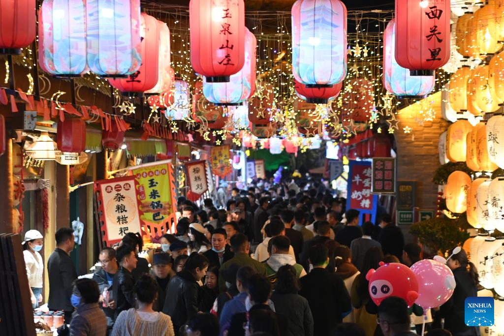 Tourists watch a performance on a commercial street in Qinzhou District of Tianshui City, northwest China's Gansu Province, March 19, 2024. At dawn, the bustling snack streets of Tianshui, a city in northwest China's Gansu Province, were already teeming with activities, with visitors eager to taste the local specialty, malatang, literally meaning a numbingly spicy hotpot. (Xinhua/Ma Xiping)