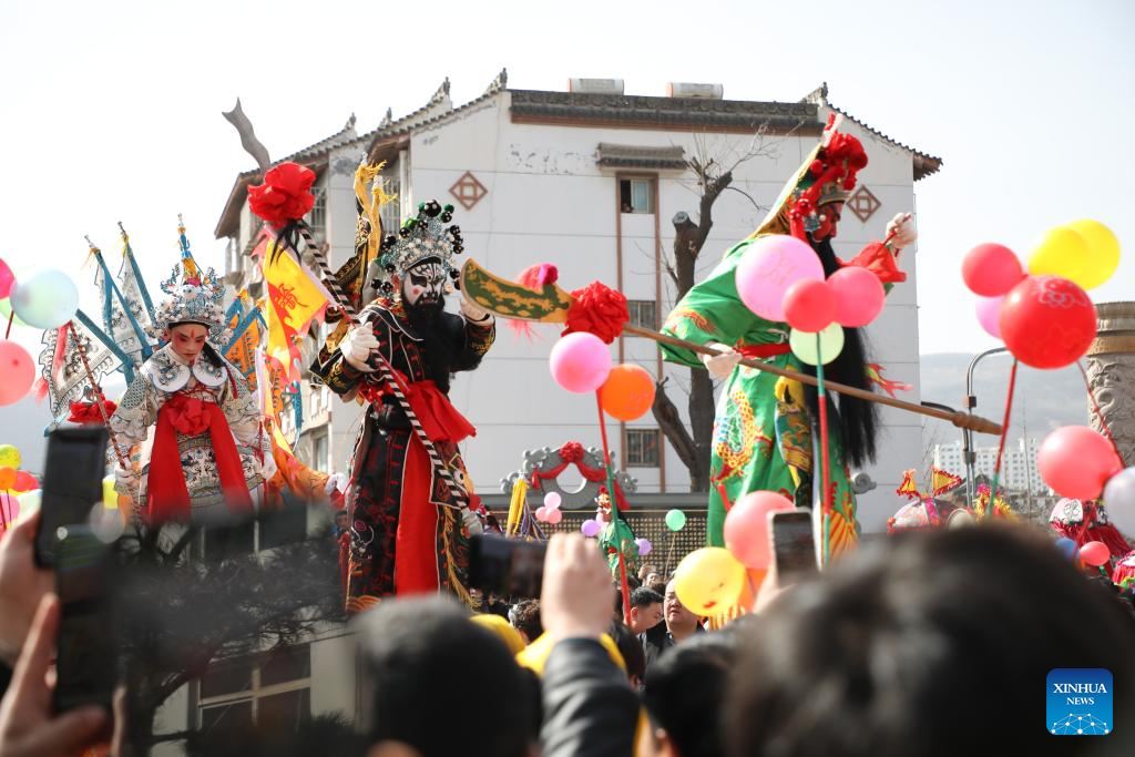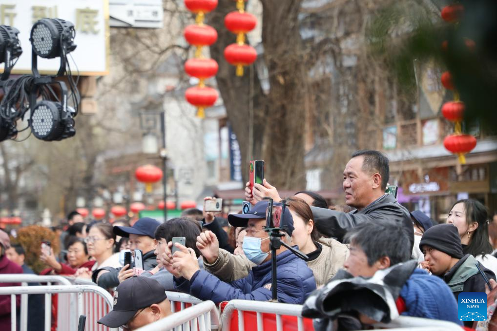 Shehuo performers stage a show for tourists at the ancient city of Tianshui in Qinzhou District of Tianshui City, northwest China's Gansu Province, March 20, 2024. Shehuo is a traditional carnival-like folk celebration, featuring folk performances that may vary from dragon dance, lion dance, to traditional Chinese opera, drum playing in different regions. At dawn, the bustling snack streets of Tianshui, a city in northwest China's Gansu Province, were already teeming with activities, with visitors eager to taste the local specialty, malatang, literally meaning a numbingly spicy hotpot. (Xinhua/Ma Xiping)