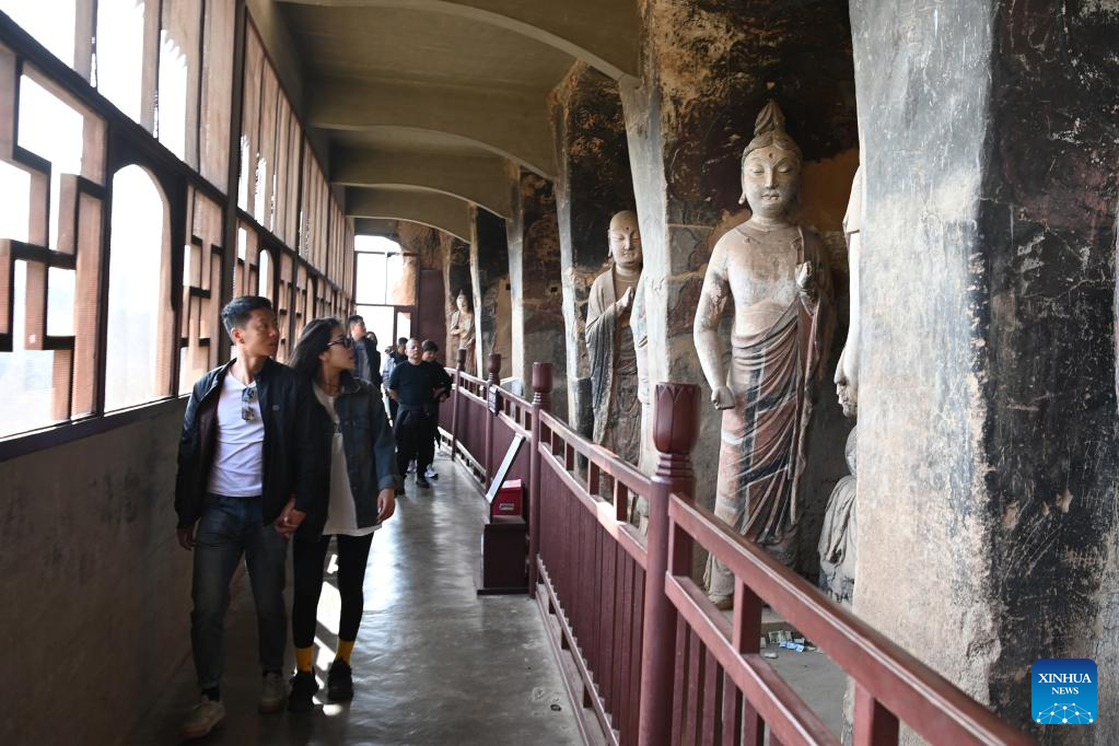 Tourists visit the Maiji Mountain Grottoes in Maiji District of Tianshui City, northwest China's Gansu Province, March 20, 2024. At dawn, the bustling snack streets of Tianshui, a city in northwest China's Gansu Province, were already teeming with activities, with visitors eager to taste the local specialty, malatang, literally meaning a numbingly spicy hotpot. (Xinhua/Fan Peishen)