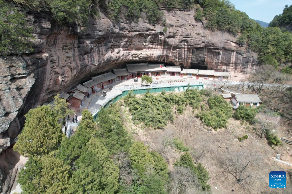 An aerial drone photo taken on March 20, 2024 shows a scenic spot in Maiji District of Tianshui City, northwest China's Gansu Province. At dawn, the bustling snack streets of Tianshui, a city in northwest China's Gansu Province, were already teeming with activities, with visitors eager to taste the local specialty, malatang, literally meaning a numbingly spicy hotpot. (Xinhua/Fan Peishen)