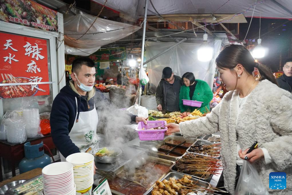 LANZHOU, March 20 (Xinhua) -- At dawn, the bustling snack streets of Tianshui, a city in northwest China's Gansu Province, were already teeming with activity, with visitors eager to taste the local specialty, malatang, literally meaning a numbingly spicy hotpot.