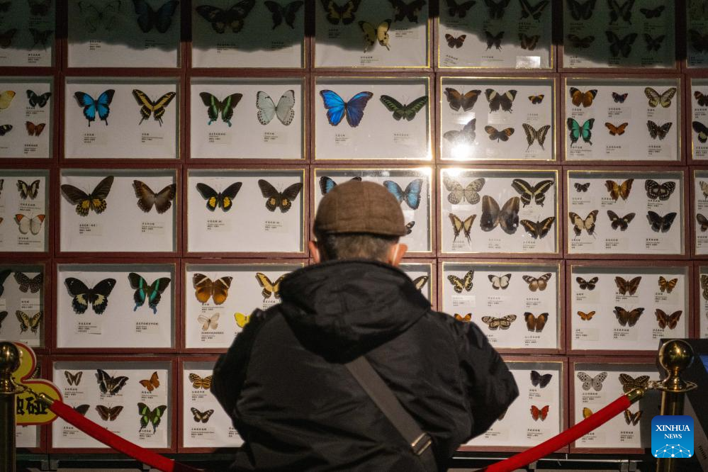 A tourist takes photos of butterfly specimens at the China (Harbin) Forest Museum in Harbin, northeast China's Heilongjiang Province, March 21, 2024. The World Forest Day falls on March 21. (Xinhua/Xie Jianfei)