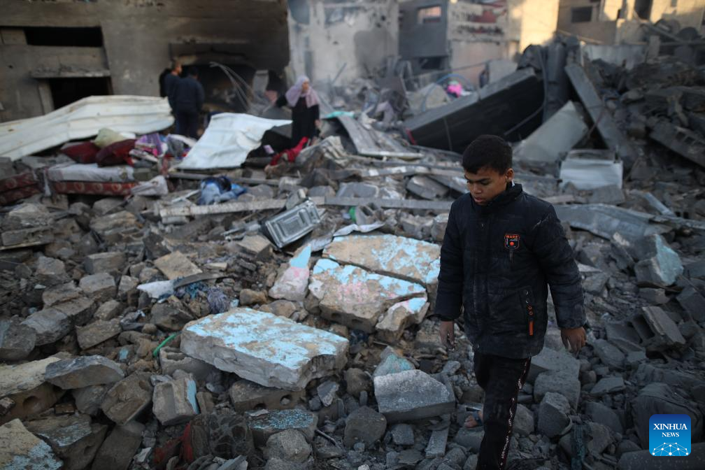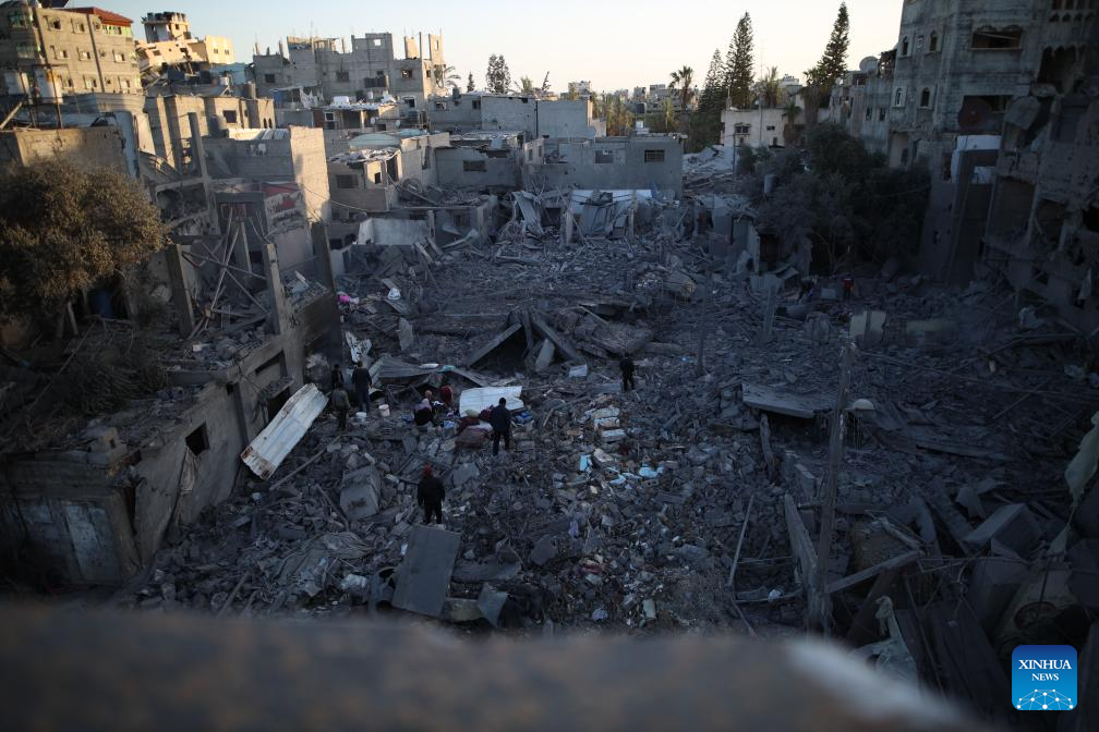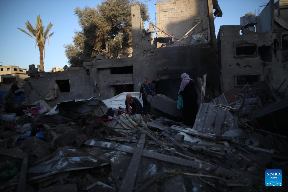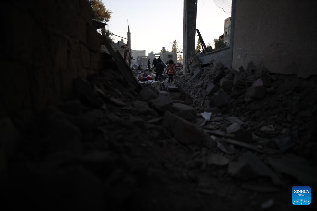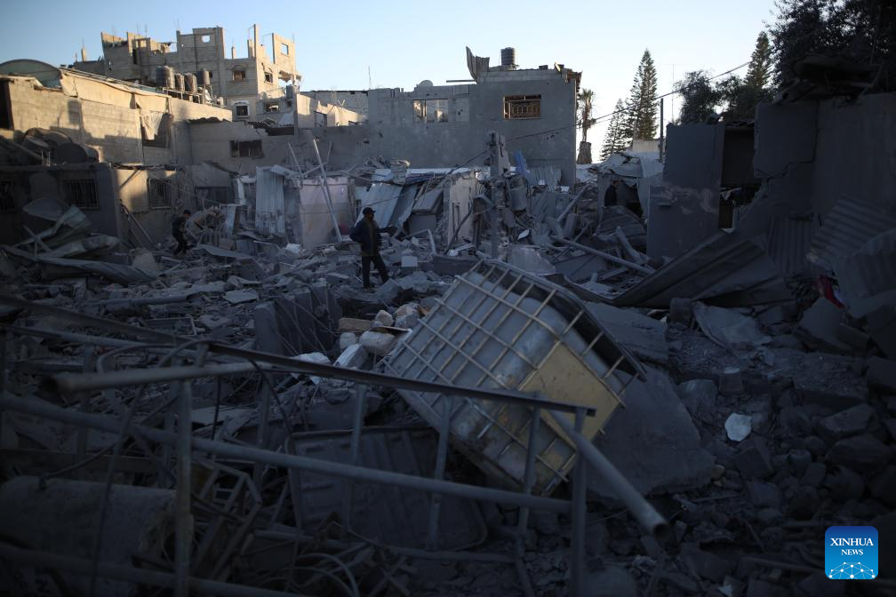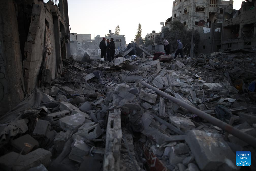 People are seen among the rubble after an Israeli airstrike in Maghazi refugee camp, central Gaza Strip, on March 21, 2024. The death toll from ongoing Israeli attacks on the Gaza Strip has risen to 31,988, the Hamas-run Ministry of Health in Gaza announced Thursday. (Xinhua)