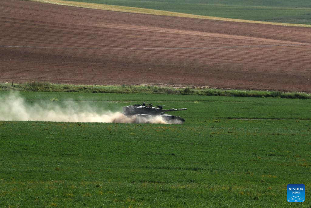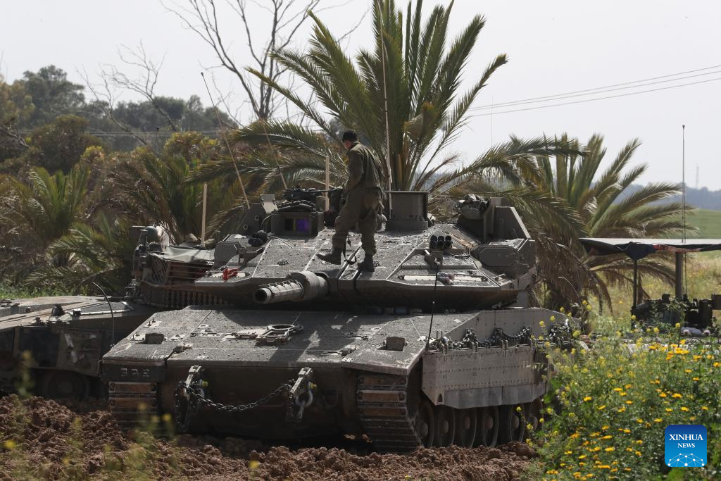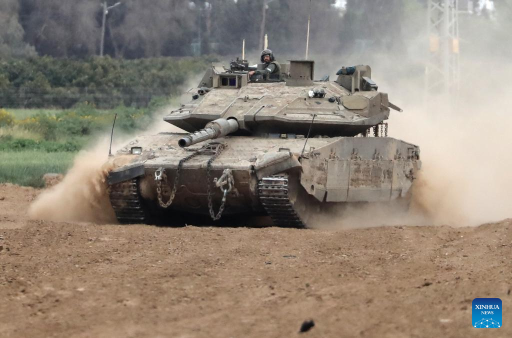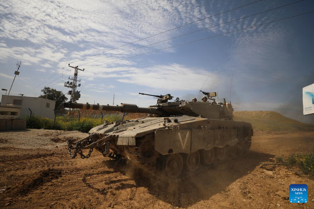 An Israeli tank is seen amid the ongoing Israel-Hamas conflict near Nir Am, a kibbutz in southern Israel, on March 21, 2024. the Hamas-run Ministry of Health in Gaza said Thursday in a statement that the Israeli army killed 65 Palestinians and wounded 92 others during the past 24 hours, bringing the total death toll to 31,988 and injuries to 74,188 since the Israel-Hamas conflict broke out on Oct. 7, 2023. Israel has been launching a large-scale offensive against Hamas in the Gaza Strip to retaliate against a Hamas rampage through the southern Israeli border on Oct. 7, 2023, during which about 1,200 people were killed and more than 200 were taken hostage. (Photo by Jamal Awad/Xinhua)