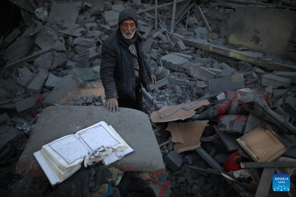 A man stands on the rubble after an Israeli airstrike in Maghazi refugee camp, central Gaza Strip, on March 21, 2024. The death toll from ongoing Israeli attacks on the Gaza Strip has risen to 31,988, the Hamas-run Ministry of Health in Gaza announced Thursday. (Xinhua)
