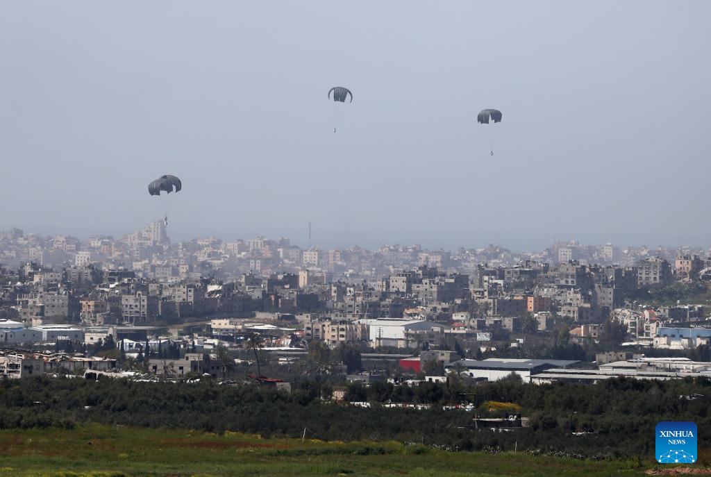 Airdropped humanitarian aid falls toward the Gaza Strip amid the ongoing Israel-Hamas conflict, seen from near Nir Am, a kibbutz in southern Israel, on March 21, 2024. the Hamas-run Ministry of Health in Gaza said Thursday in a statement that the Israeli army killed 65 Palestinians and wounded 92 others during the past 24 hours, bringing the total death toll to 31,988 and injuries to 74,188 since the Israel-Hamas conflict broke out on Oct. 7, 2023. Israel has been launching a large-scale offensive against Hamas in the Gaza Strip to retaliate against a Hamas rampage through the southern Israeli border on Oct. 7, 2023, during which about 1,200 people were killed and more than 200 were taken hostage. (Photo by Jamal Awad/Xinhua)