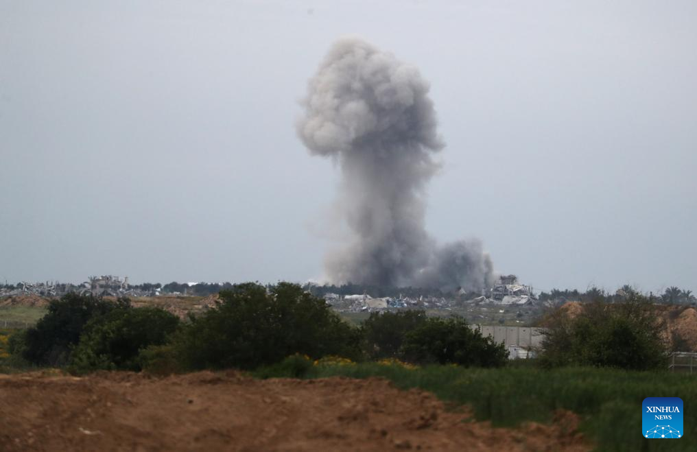 Smoke billows in Gaza amid the ongoing Israel-Hamas conflict, seen from near Nir Am, a kibbutz in southern Israel, on March 21, 2024. the Hamas-run Ministry of Health in Gaza said Thursday in a statement that the Israeli army killed 65 Palestinians and wounded 92 others during the past 24 hours, bringing the total death toll to 31,988 and injuries to 74,188 since the Israel-Hamas conflict broke out on Oct. 7, 2023. Israel has been launching a large-scale offensive against Hamas in the Gaza Strip to retaliate against a Hamas rampage through the southern Israeli border on Oct. 7, 2023, during which about 1,200 people were killed and more than 200 were taken hostage. (Photo by Jamal Awad/Xinhua)