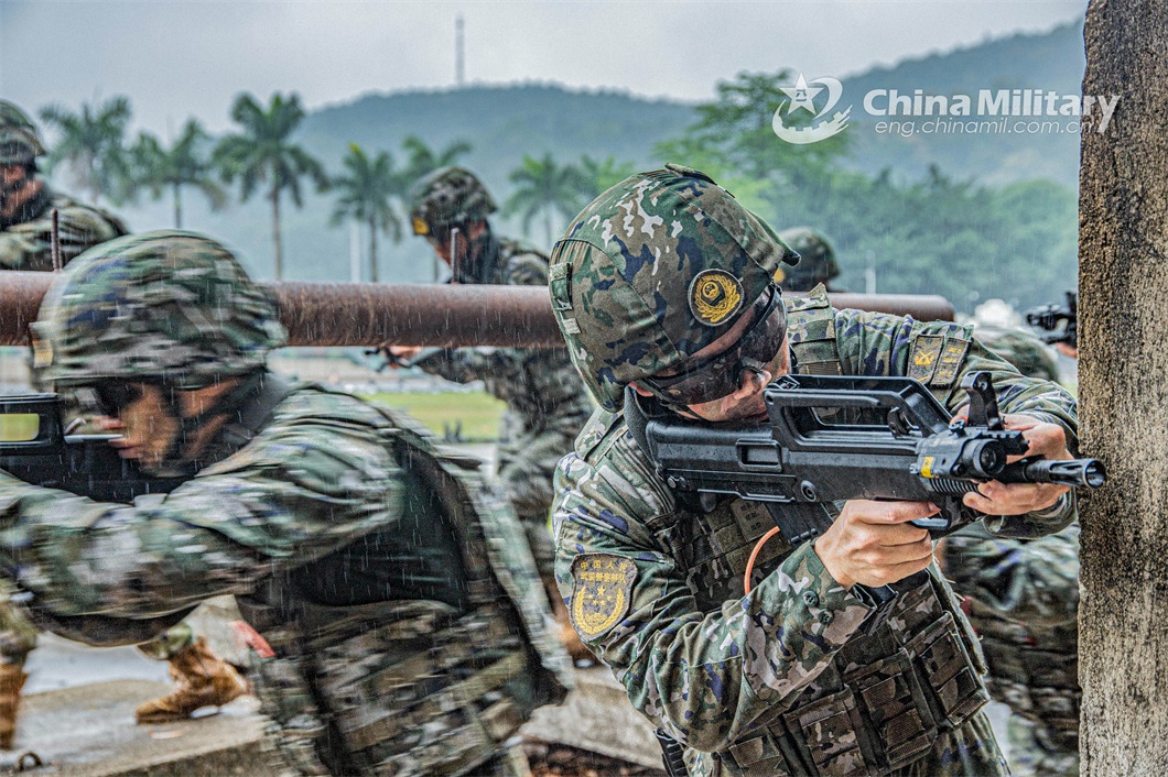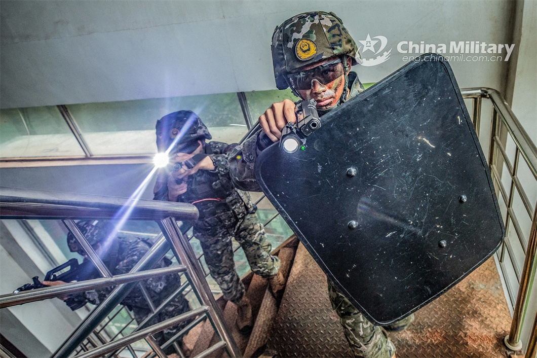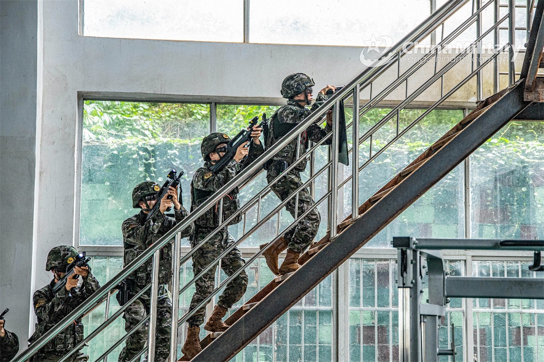 Commandos assigned to a special operations squadron of a mobile detachment under the Chinese People's Armed Police (PAP) Force Guangxi Corps search a building during a training exercise in early March, 2024. (eng.chinamil.com.cn/Photo by Liu Ming)