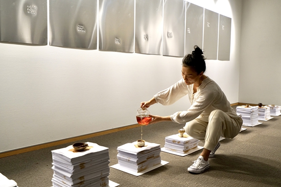 Artist Jingwei Bu presents her artwork "Pouring Tea Until It Is All Evaporated" to the audience. (Photo/Zihan Xia)