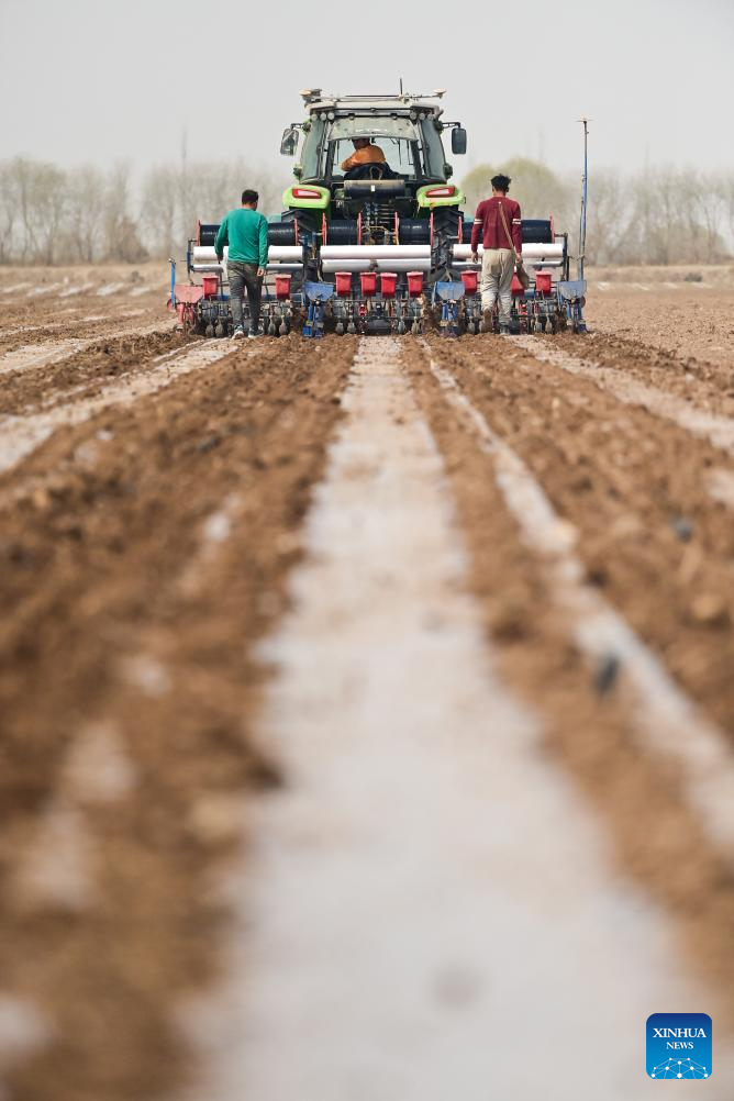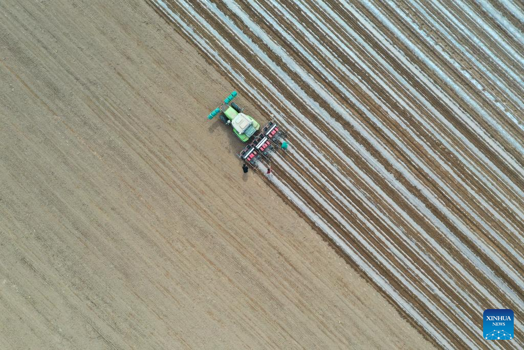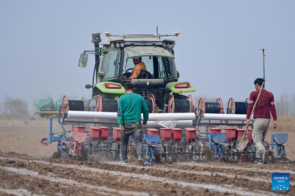 A farmer operates machine to sow seeds in a field in Tianhai Village of Liuyuan Township, Aksu Prefecture, northwest China's Xinjiang Uygur Autonomous Region, March 21, 2024. Farmers in Aksu have recently been busy with spring ploughing, sowing and other agricultural activities. (Xinhua/Ding Lei)