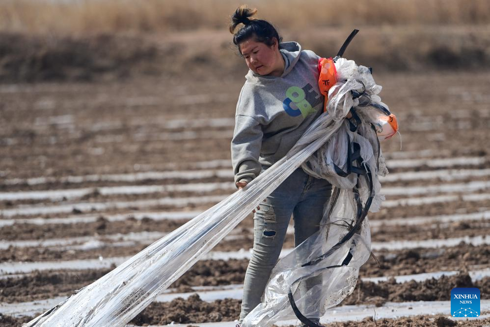 A farmer works in a field in Tianhai Village of Liuyuan Township, Aksu Prefecture, northwest China's Xinjiang Uygur Autonomous Region, March 21, 2024. Farmers in Aksu have recently been busy with spring ploughing, sowing and other agricultural activities. (Xinhua/Ding Lei)