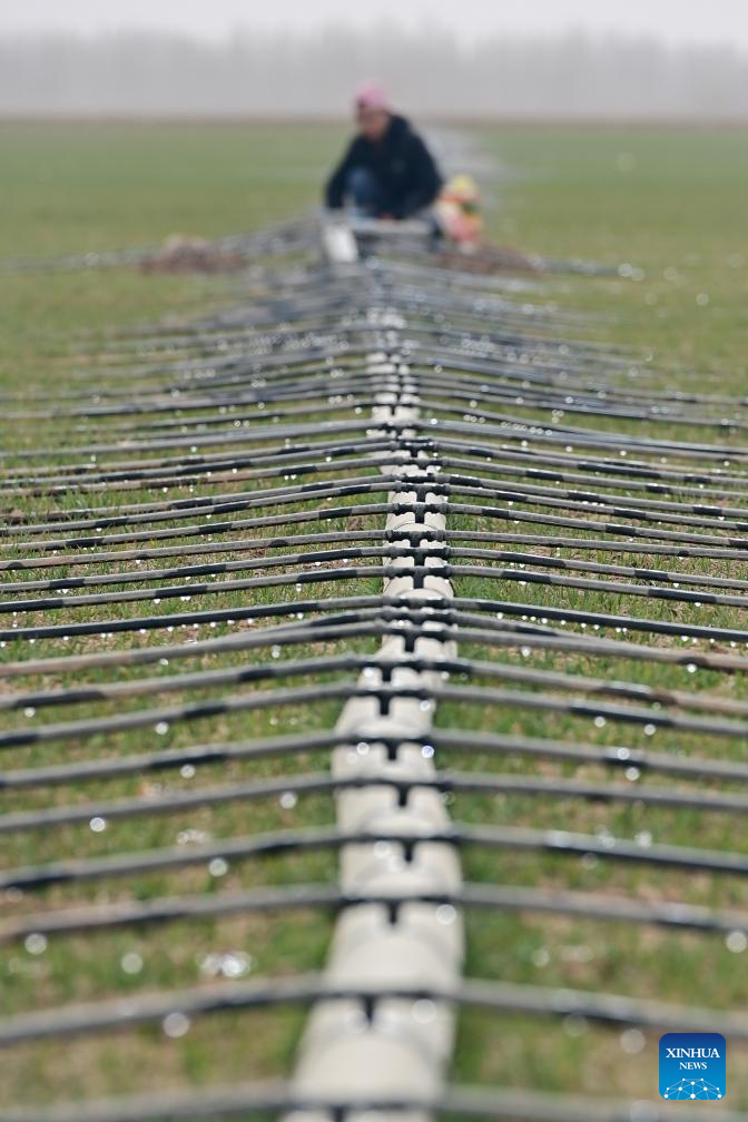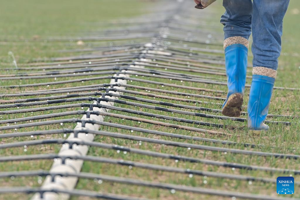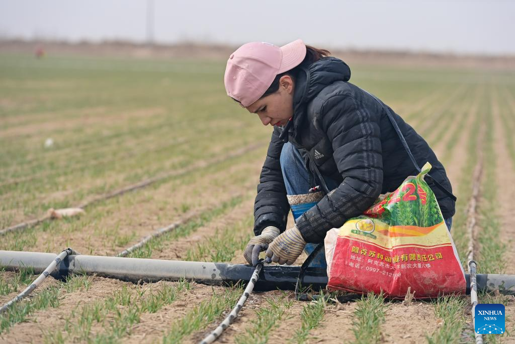 A farmer checks the drip irrigation equipment in Ruifeng Village of Liuyuan Township, Aksu Prefecture, northwest China's Xinjiang Uygur Autonomous Region, March 21, 2024. Farmers in Aksu have recently been busy with spring ploughing, sowing and other agricultural activities. (Xinhua/Ding Lei)