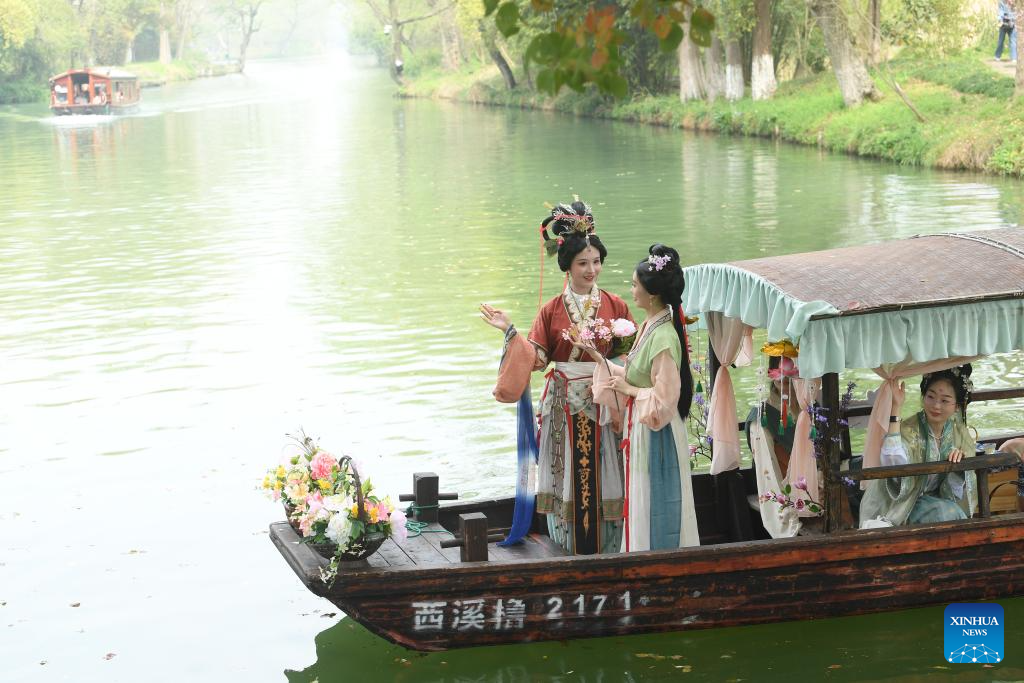 Performers in traditional costumes take a boat parade during the Huazhao Festival celebrations in Xixi Wetland in Hangzhou, east China's Zhejiang Province, March 24, 2024. The annual Huazhao Festival featuring a series of activities, including a boat parade and a folk ritual, was celebrated in Xixi Wetland on Sunday. (Xinhua/Weng Xinyang)
