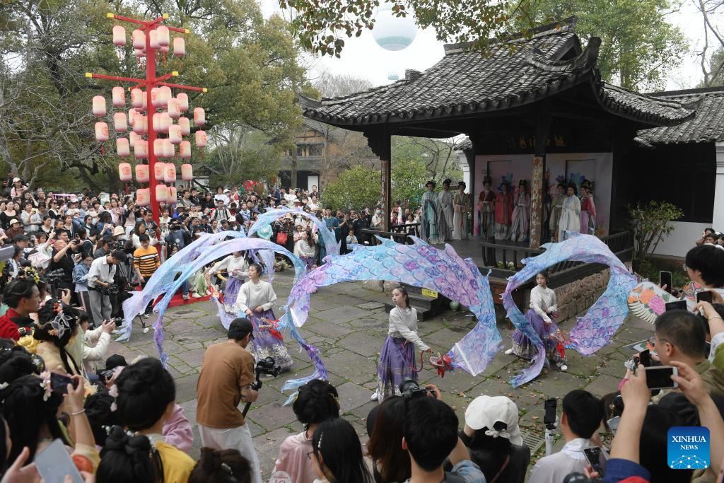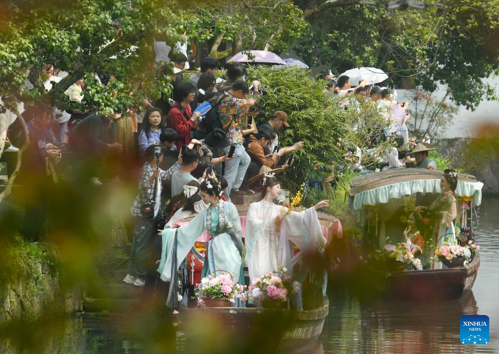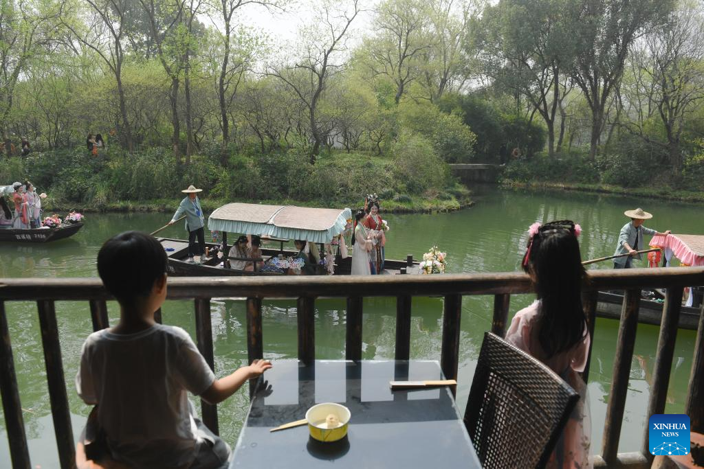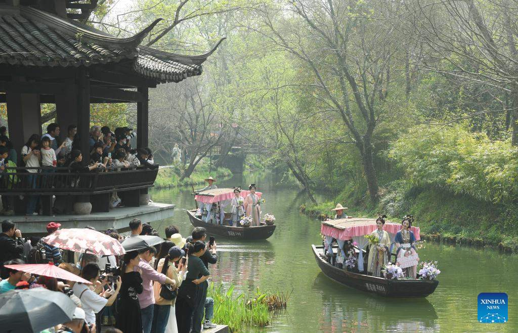 Tourists watch a performance during the Huazhao Festival celebrations in Xixi Wetland in Hangzhou, east China's Zhejiang Province, March 24, 2024. The annual Huazhao Festival featuring a series of activities, including a boat parade and a folk ritual, was celebrated in Xixi Wetland on Sunday. (Xinhua/Weng Xinyang)