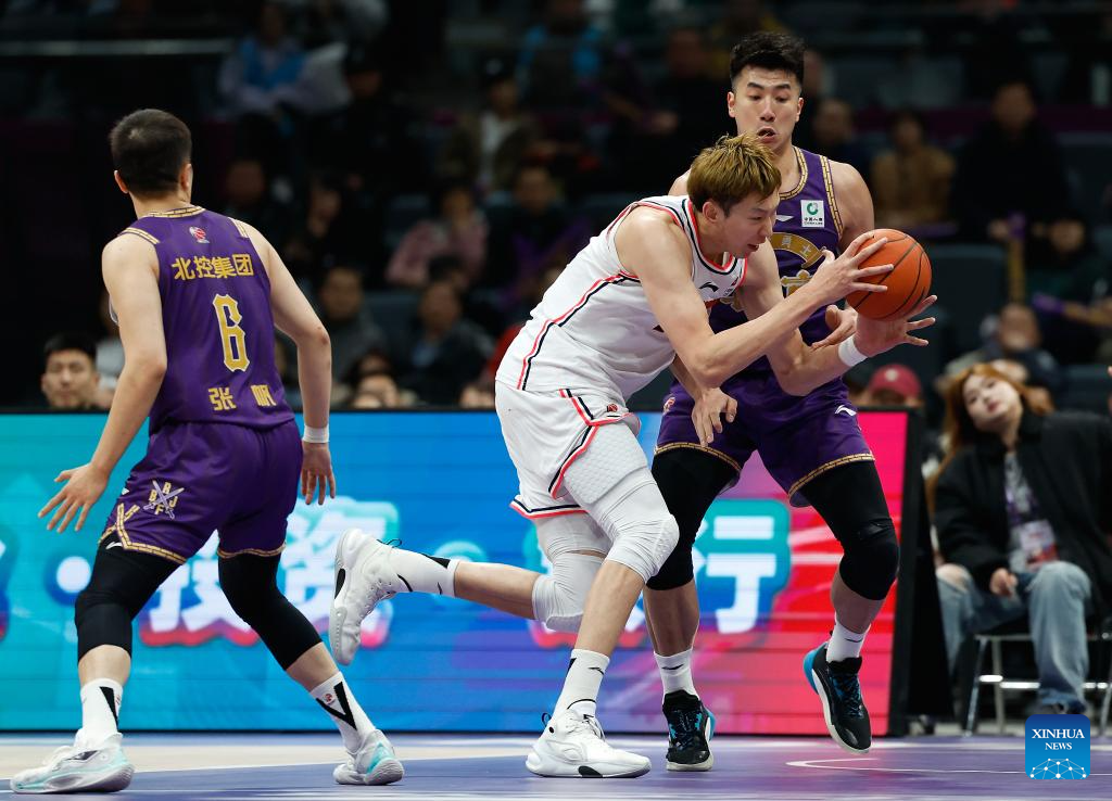 Zhou Qi (C) of Guangdong Southern Tigers competes against Zou Yuchen of Beijing Royal Fighters during the 47th round match between Beijing Royal Fighters and Guangdong Southern Tigers at the 2023-2024 Chinese Basketball Association (CBA) league in Beijing, China, March 24, 2024. (Xinhua/Wang Lili)