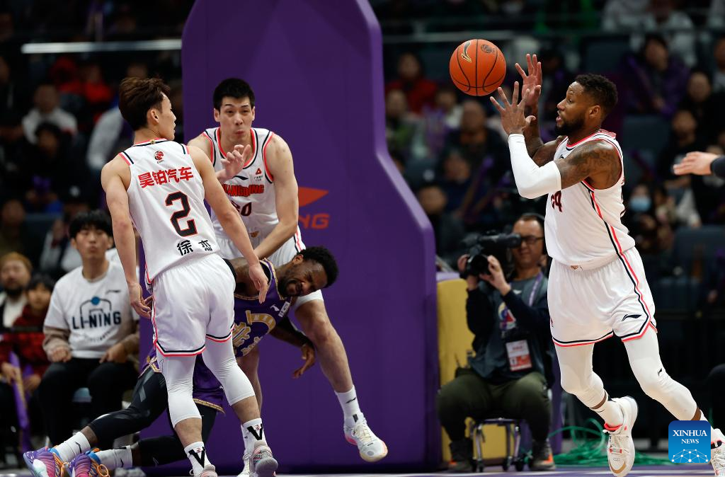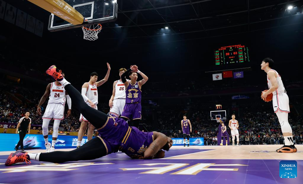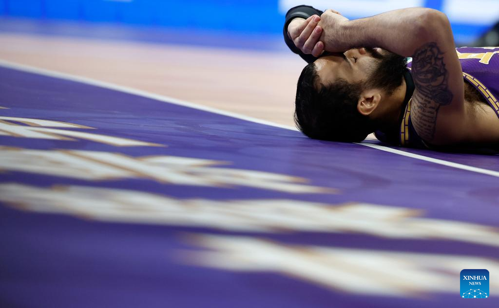 Jakarr Sampson (below) of Beijing Royal Fighters falls on the court during the 47th round match between Beijing Royal Fighters and Guangdong Southern Tigers at the 2023-2024 Chinese Basketball Association (CBA) league in Beijing, China, March 24, 2024. (Xinhua/Wang Lili)