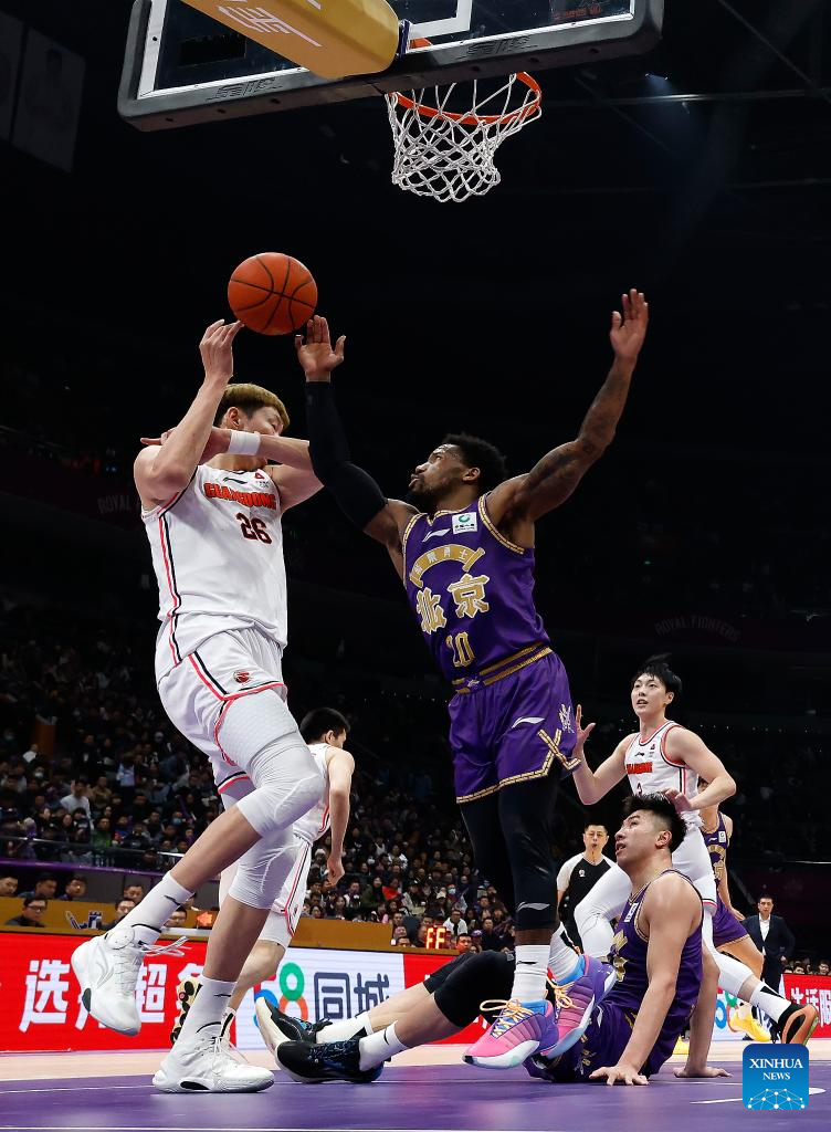 Clarence Weems (1st R) of Guangdong Southern Tigers grabs the ball during the 47th round match between Beijing Royal Fighters and Guangdong Southern Tigers at the 2023-2024 Chinese Basketball Association (CBA) league in Beijing, China, March 24, 2024. (Xinhua/Wang Lili)