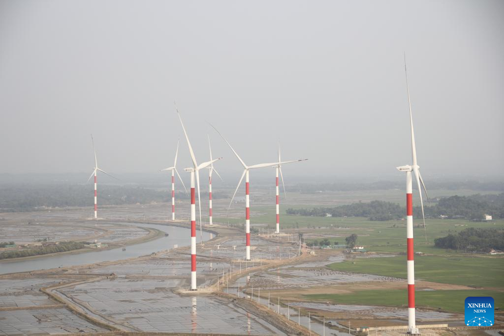 This photo taken on March 23, 2024 shows the site of Cox's Bazar wind plant in Cox's Bazar district, Bangladesh. With the last wind-driven generator installed, Cox's Bazar wind plant, the first centralized wind power project in Bangladesh invested and constructed by Chinese enterprises, was fully put into operation on Sunday. (Xinhua/Sun Nan)