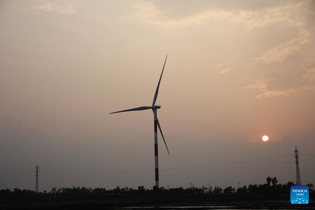 This photo taken on March 22, 2024 shows the site of Cox's Bazar wind plant in Cox's Bazar district, Bangladesh. With the last wind-driven generator installed, Cox's Bazar wind plant, the first centralized wind power project in Bangladesh invested and constructed by Chinese enterprises, was fully put into operation on Sunday. (Xinhua/Sun Nan)