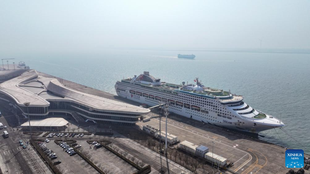 An aerial drone photo taken on March 23, 2024 shows the Dream cruise ship berthing at Tianjin International Cruise Home Port in north China's Tianjin Municipality. As the largest cruise home port in north China, Tianjin International Cruise Home Port has handled more than 200,000 inbound and outbound passengers since its full resumption of international cruise ship transport on Sept. 27, 2023.