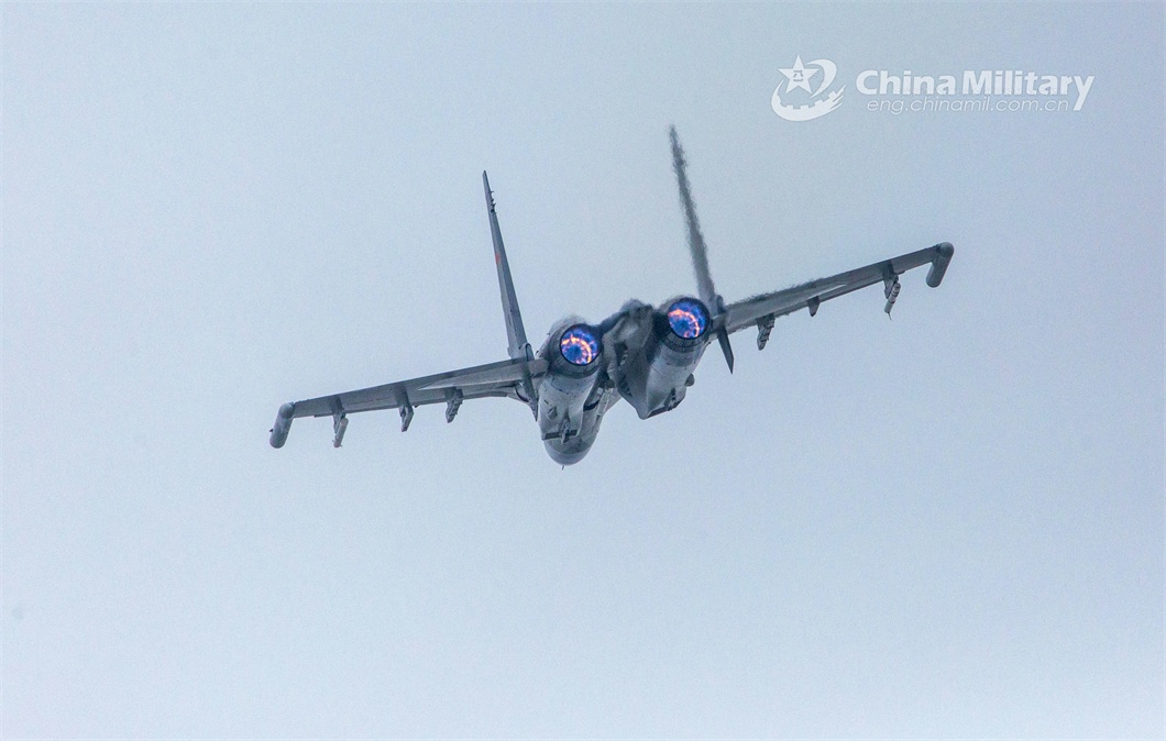 A fighter jet attached to an aviation brigade with the air force under the PLA Eastern Theater Command unfolds landing gear before landing during a flight training exercise held on March 2, 2024. (eng.chinamil.com.cn/Photo by Huang Guotai)