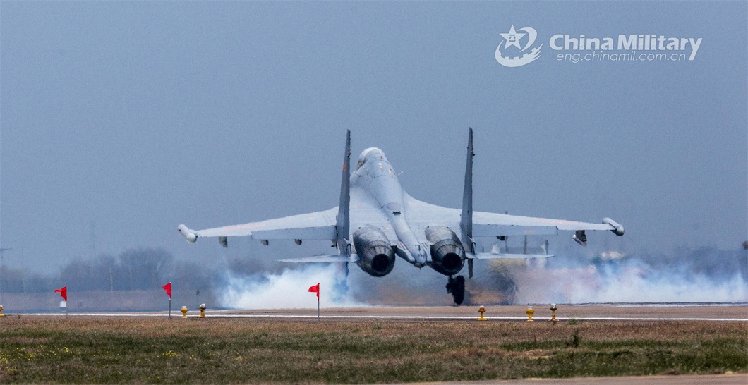 A fighter jet attached to an aviation brigade with the air force under the PLA Eastern Theater Command maneuvers during a flight training exercise on March 2, 2024. (eng.chinamil.com.cn/Photo by Huang Guotai)