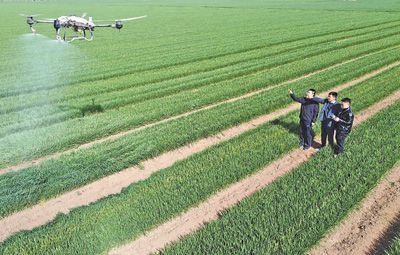 After breakfast, Ning Yong, a villager from Zhangwulou village in Wangmingkou township, Xiangcheng city in central China's Henan Province headed to his wheat fields and contacted the township's aerial spraying service team, asking the latter to send drones to spray herbicides, insecticides, and fungicides, and plant growth regulators on his wheat.
