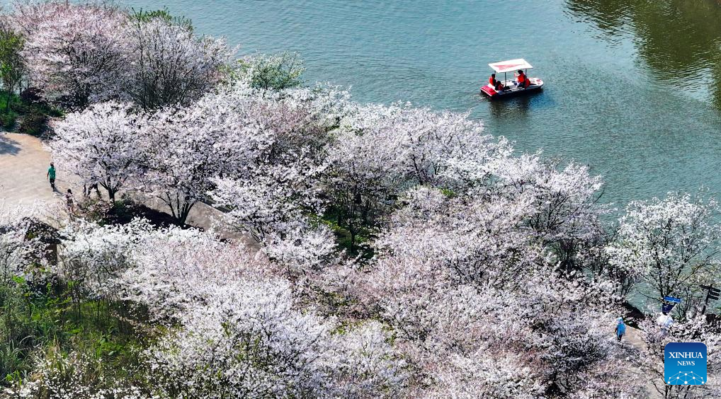 An aerial drone photo taken on March 24, 2024 shows people taking a sightseeing boat to enjoy cherry blossoms in Jianshe Village, Luzhou City of southwest China's Sichuan Province. (Photo by Liu Xueyi/Xinhua)