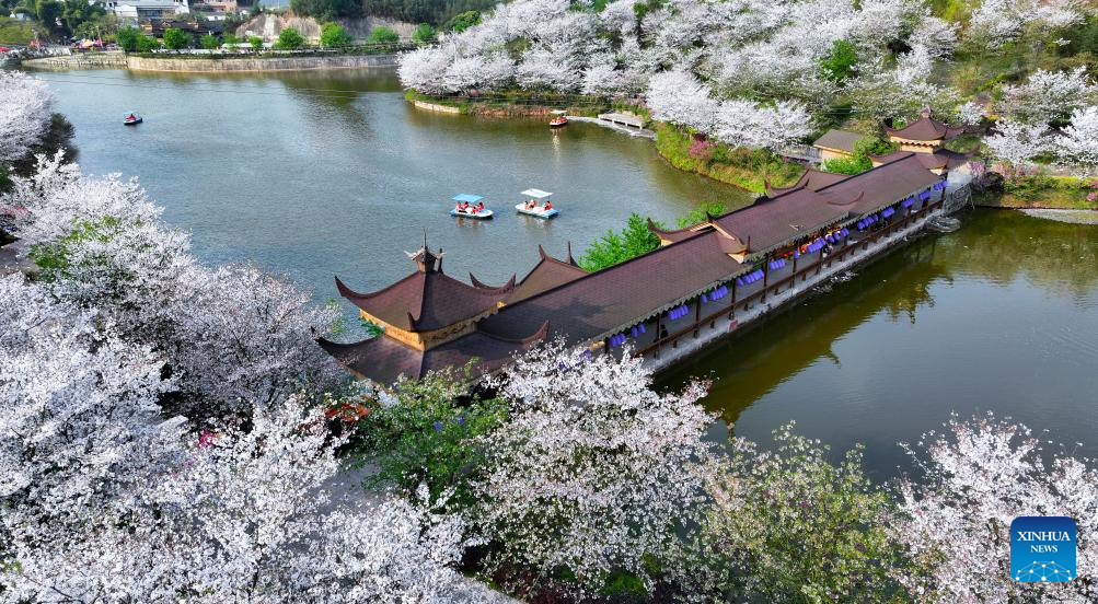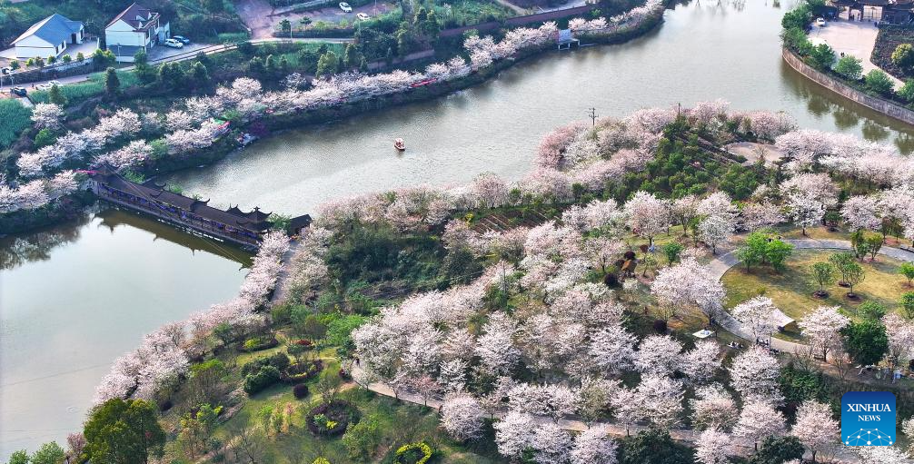 An aerial drone photo taken on March 24, 2024 shows people taking sightseeing boats to enjoy cherry blossoms in Jianshe Village, Luzhou City of southwest China's Sichuan Province. (Photo by Liu Xueyi/Xinhua)
