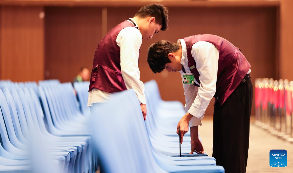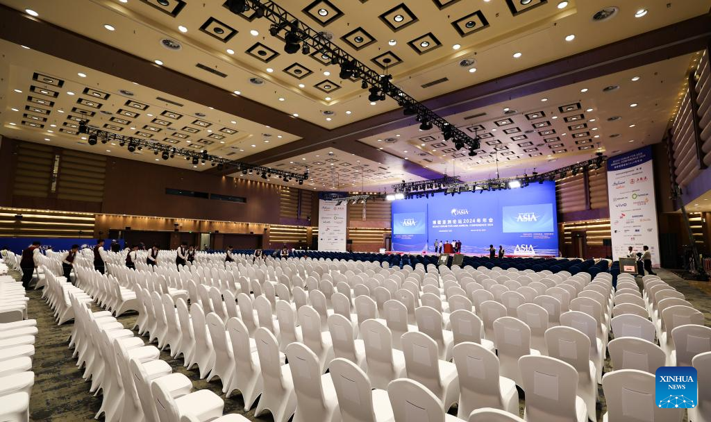 Staff members work at the main venue of Boao Forum for Asia (BFA) Annual Conference 2024 in Boao, south China's Hainan Province, March 25, 2024. The Boao Forum for Asia (BFA) Annual Conference 2024 will be held from March 26 to 29 in Boao, focusing on how the international community can work together to deal with common challenges and shoulder their responsibilities. (Xinhua/Yang Guanyu)