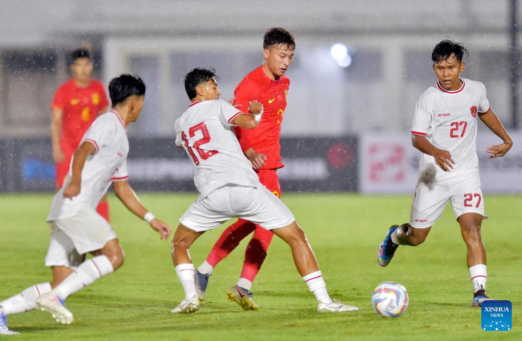 Xiahezhati Wujiahemaiti (2nd R) vies with Welberlieskott De Jardim (3rd R) of Indonesia during the U20 international friendly match between China and Indonesia in Jakarta, Indonesia, March 25, 2024. (Xinhua/Veri Sanovri)