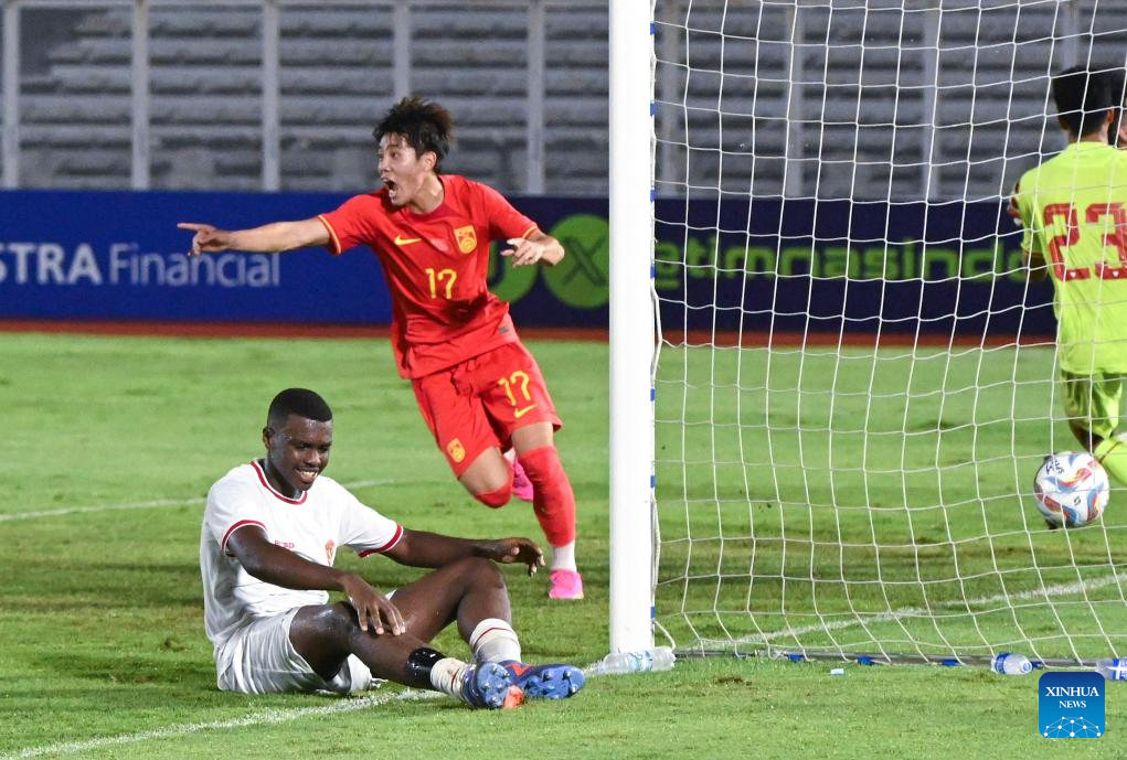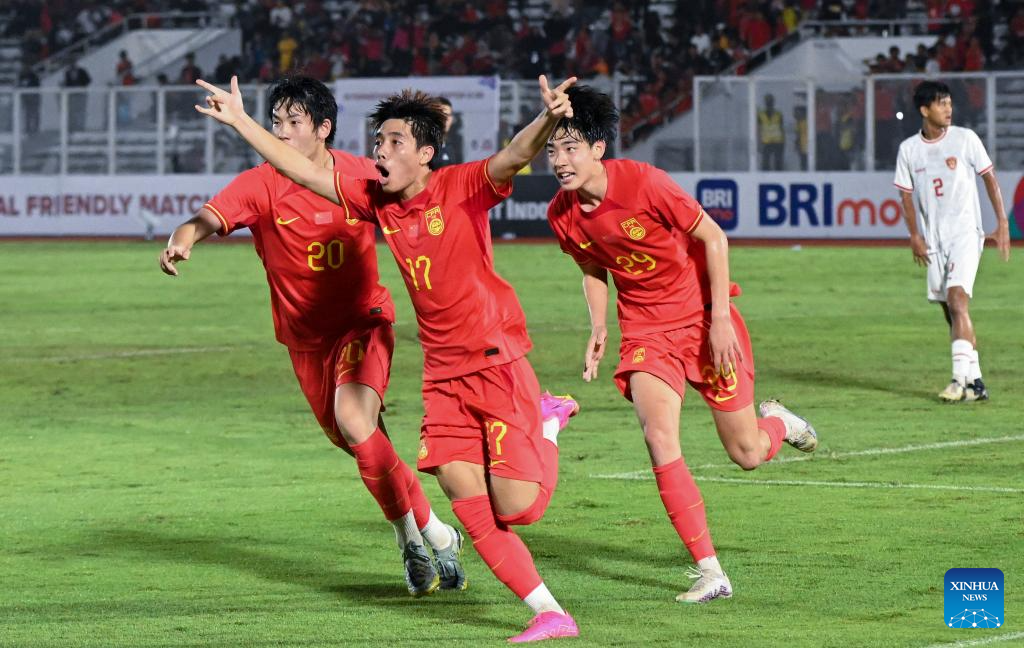 Zhong Wen (C) of China celebrates after scoring during the U20 international friendly match between China and Indonesia in Jakarta, Indonesia, March 25, 2024. (Xinhua/Veri Sanovri)