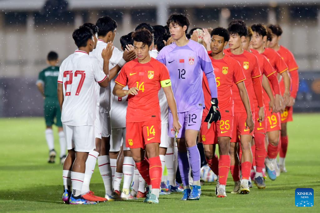 Players greet each others before the U20 international friendly match between China and Indonesia in Jakarta, Indonesia, March 25, 2024. (Xinhua/Veri Sanovri)