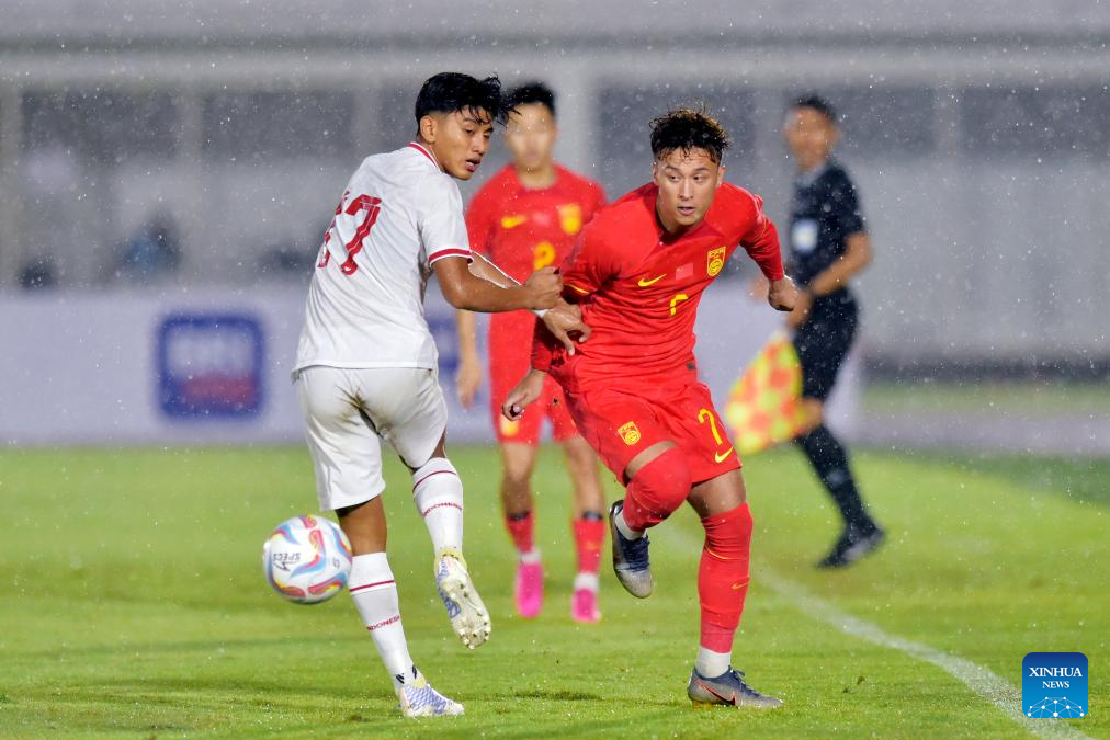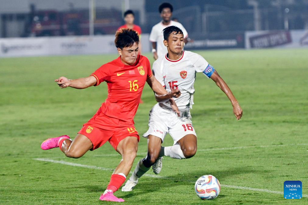 Xiahezhati Wujiahemaiti (R) of China vies with Muh. Mufli Hidayat (L) of Indonesia during the U20 international friendly match between China and Indonesia in Jakarta, Indonesia, March 25, 2024. (Xinhua/Veri Sanovri)