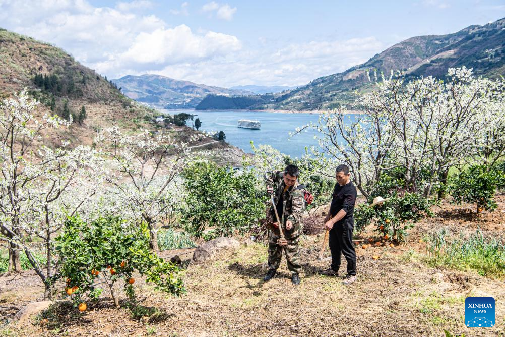 Villagers work at a plum plantation in Quchi Township of Wushan County, southwest China's Chongqing Municipality, on March 25, 2024. More than 20,000 mu (about 1333.3 hectares) of plum trees on the banks of the Yangtze River in Quchi Township are in bloom. (Xinhua/Tang Yi)