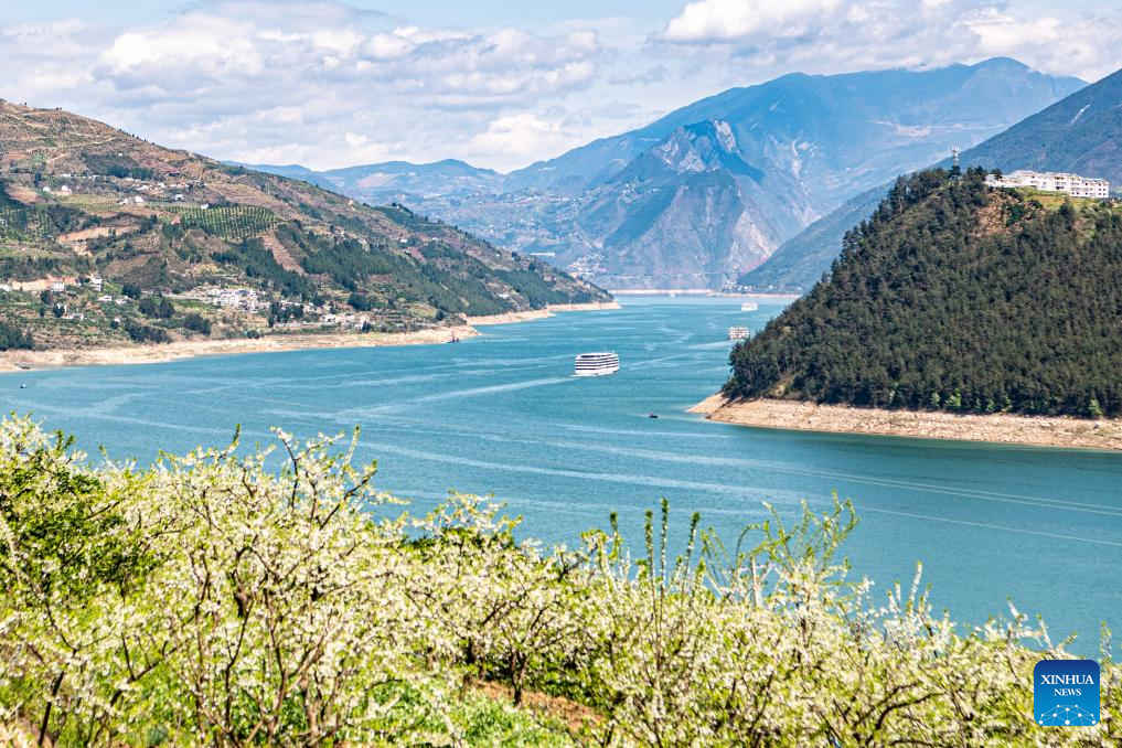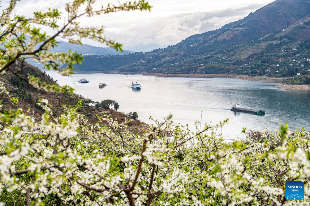 This photo taken on March 25, 2024 shows plum blossoms on the bank of the Yangtze River in Quchi Township of Wushan County, southwest China's Chongqing Municipality. More than 20,000 mu (about 1333.3 hectares) of plum trees on the banks of the Yangtze River in Quchi Township are in bloom. (Xinhua/Tang Yi)