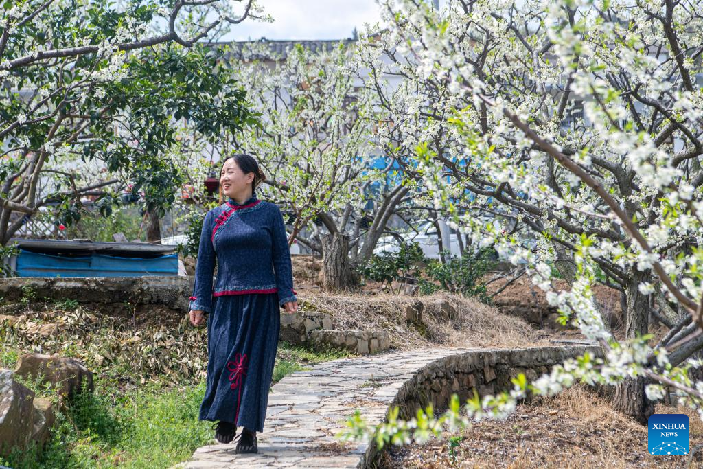 A tourist views plum blossoms at a plum plantation in Quchi Township of Wushan County, southwest China's Chongqing Municipality, on March 25, 2024. More than 20,000 mu (about 1333.3 hectares) of plum trees on the banks of the Yangtze River in Quchi Township are in bloom. (Xinhua/Tang Yi)