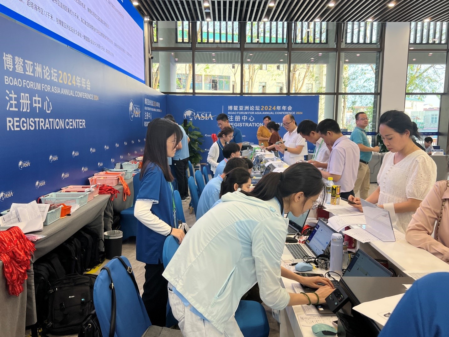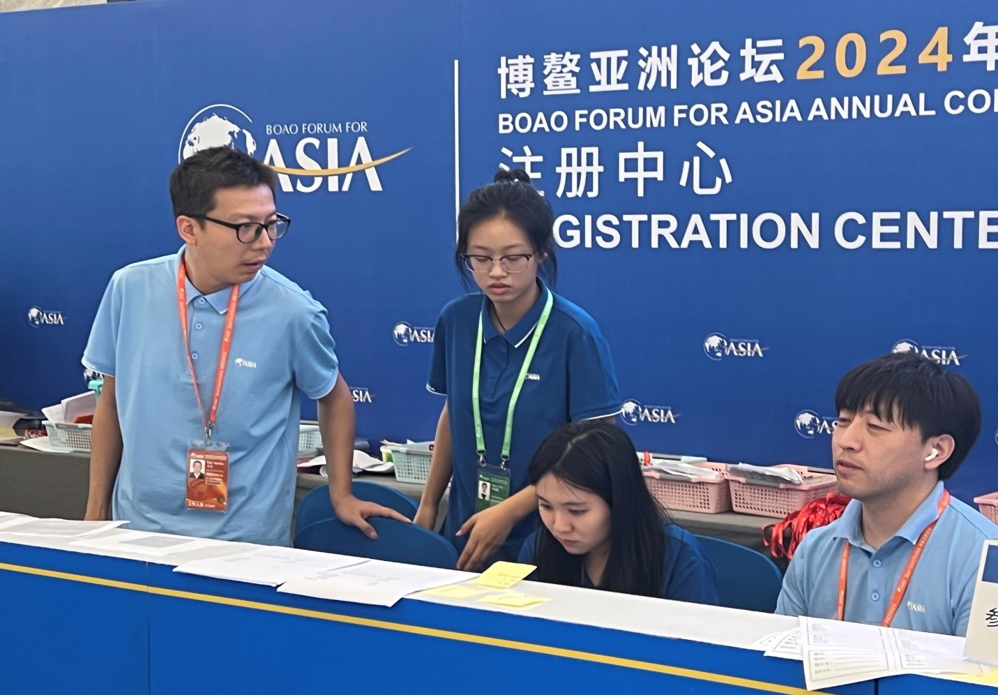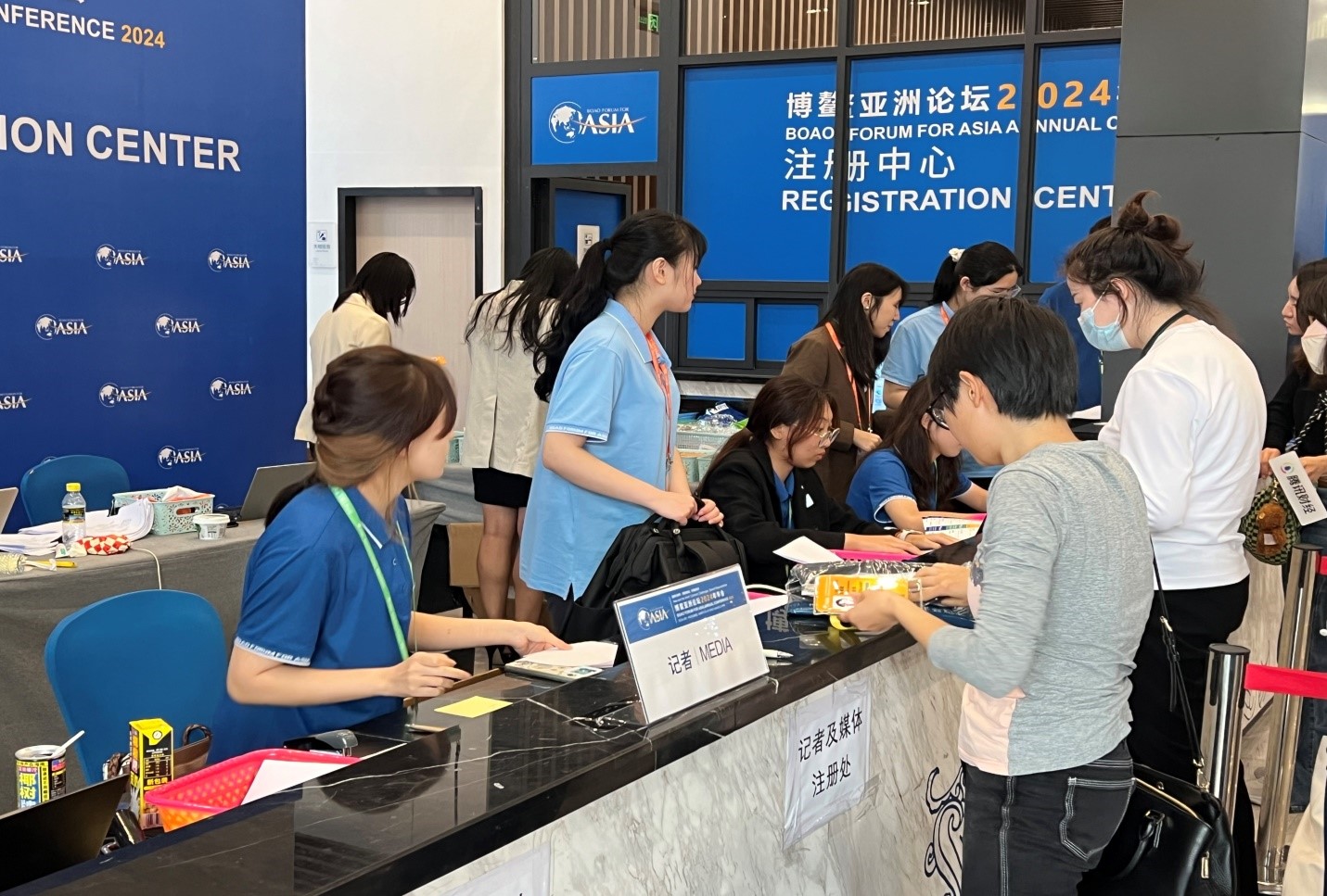 Staff members are seen at the front desk of the journalists’ registration center for the annual conference of Boao Forum for Asia 2024 in Boao, south China's Hainan Province, March 25, 2024. (Photo/People's Daily Online)