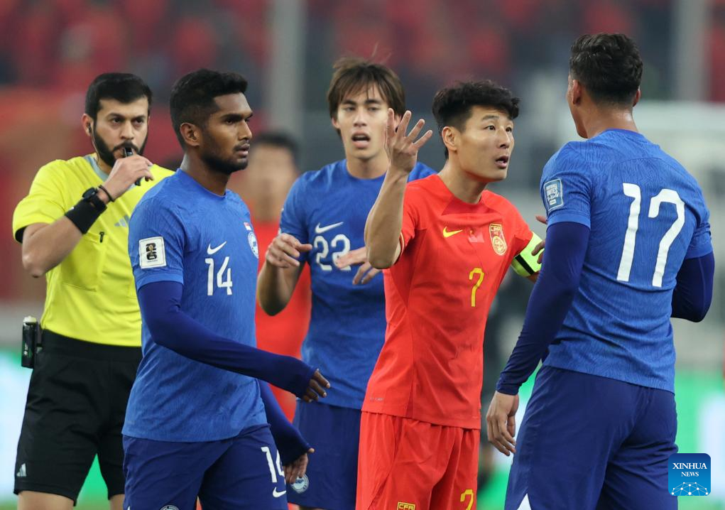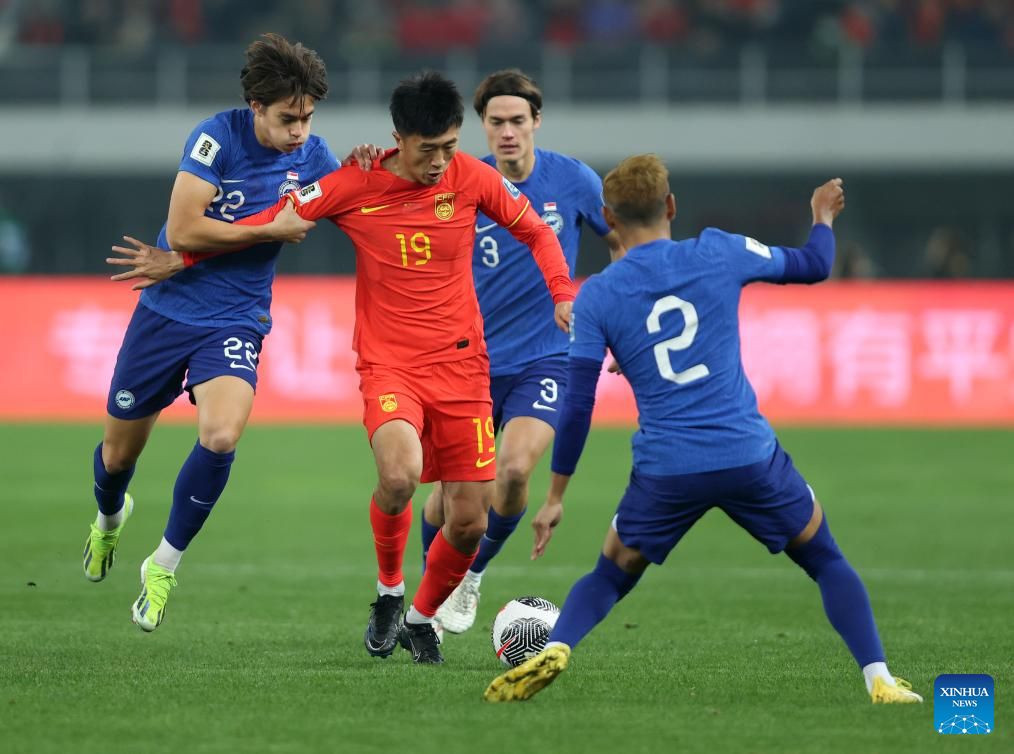 TIANJIN, March 26 (Xinhua) -- Wu Lei contributed two goals and one assist for China as the home team beat Singapore 4-1 in Group C of the 2026 FIFA World Cup Asian qualifiers second stage here on Tuesday.