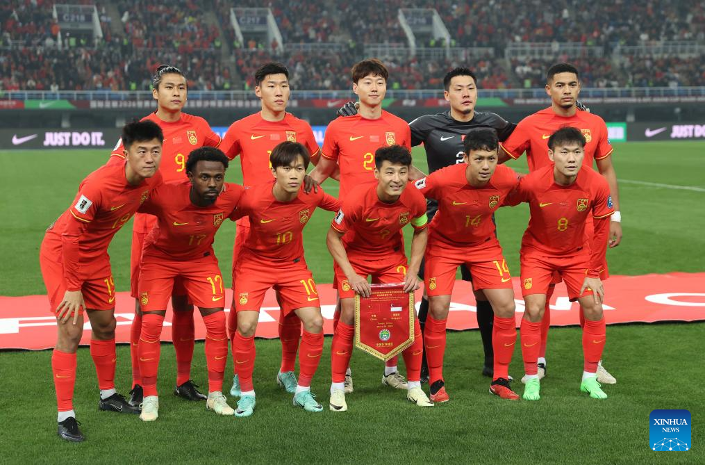 Starting players of China line up prior to the group C match of 2026 FIFA World Cup Asian qualifiers between China and Singapore in north China's Tianjin Municipality on March 26, 2024. (Xinhua/Jia Haocheng)