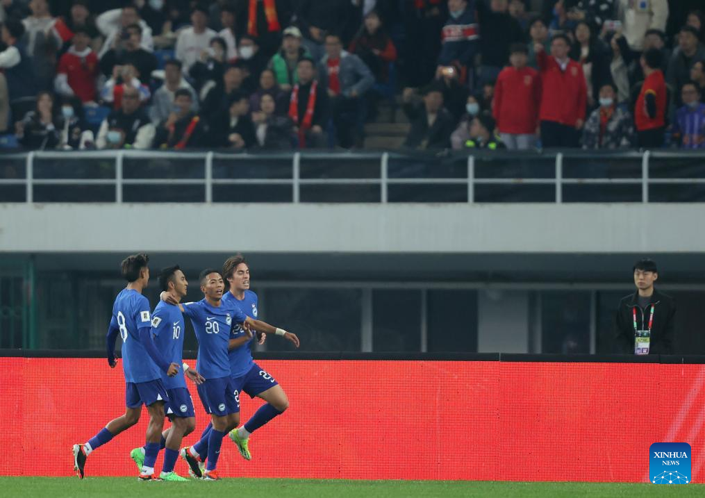 Muhammad Faris Ramli (2nd L) of Singapore celebrates scoring with his teammates during the group C match of 2026 FIFA World Cup Asian qualifiers between China and Singapore in north China's Tianjin Municipality on March 26, 2024. (Xinhua/Jia Haocheng)