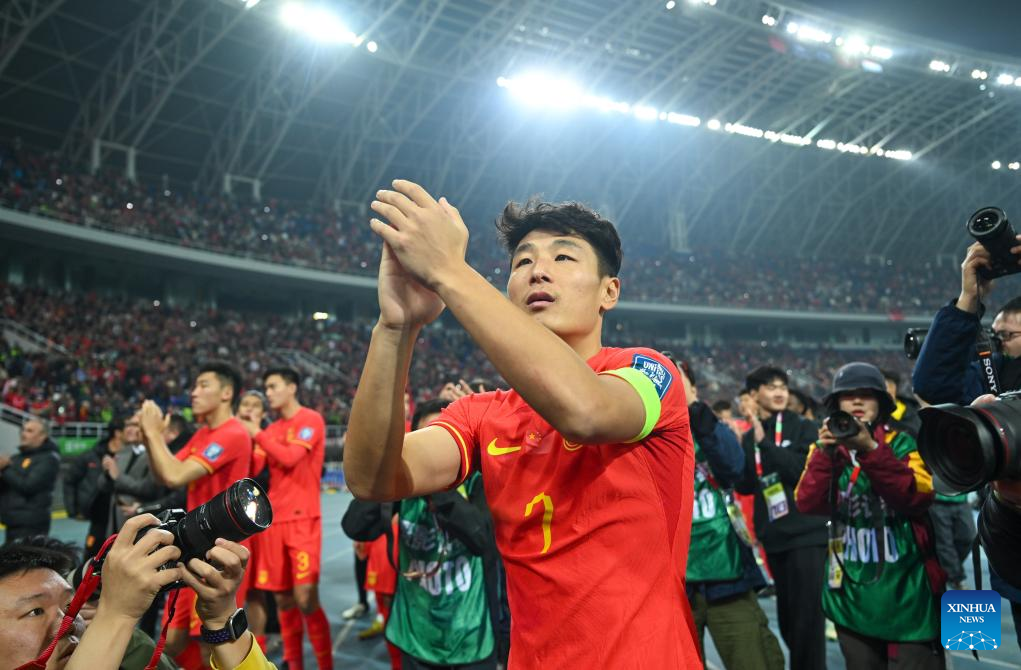 Wu Lei of China greets the spectators after winning the group C match of 2026 FIFA World Cup Asian qualifiers between China and Singapore in north China's Tianjin Municipality on March 26, 2024. (Xinhua/Sun Fanyue)