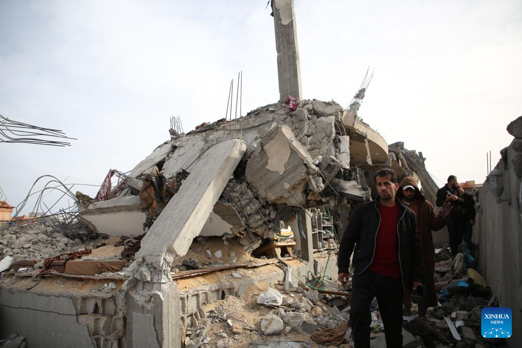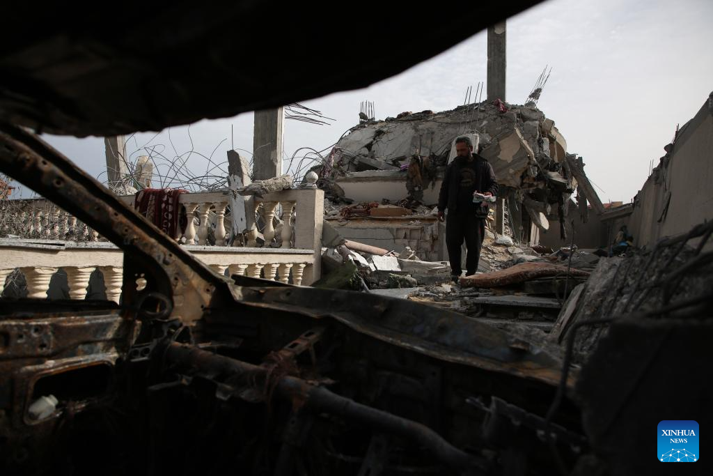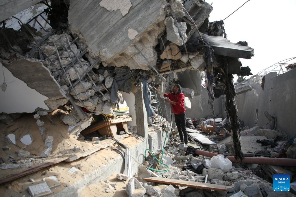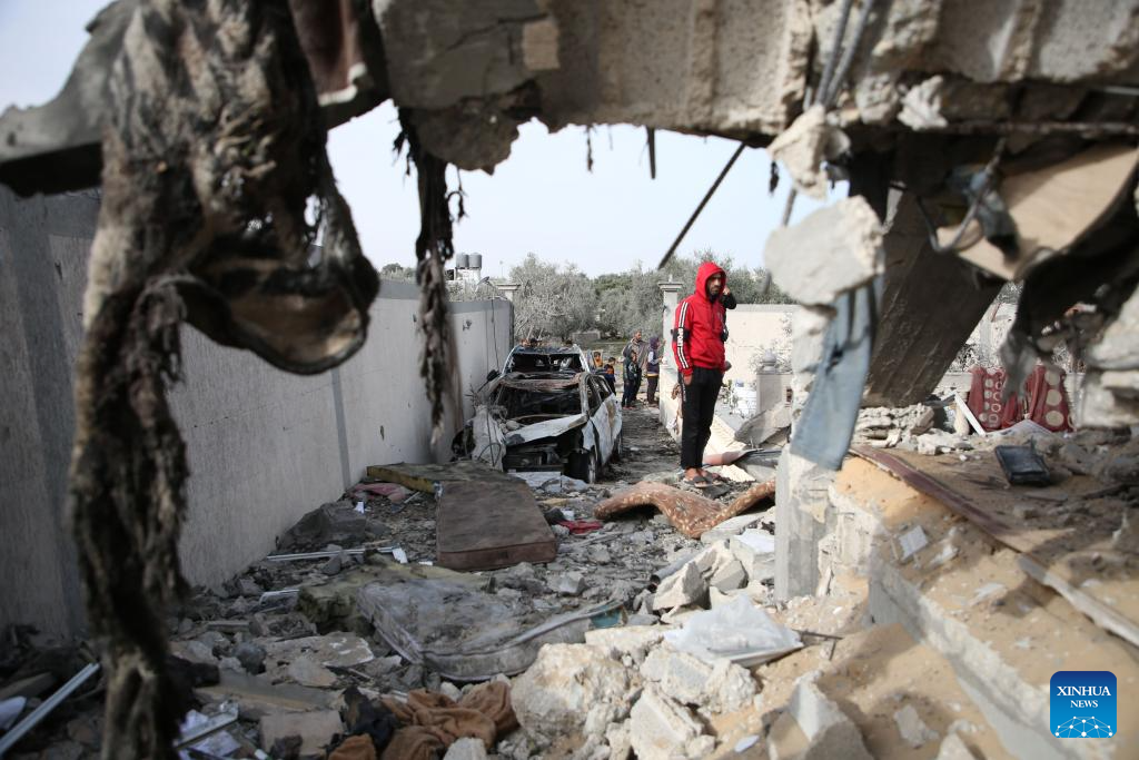 A man inspects a destroyed building after an Israeli airstrike in the southern Gaza Strip city of Rafah, on March 26, 2024. The Palestinian death toll in the Gaza Strip from ongoing Israeli attacks has risen to 32,414, the Hamas-run Health Ministry said in a press statement on Tuesday. (Photo by Khaled Omar/Xinhua)