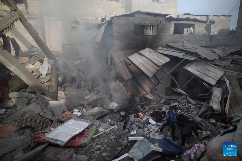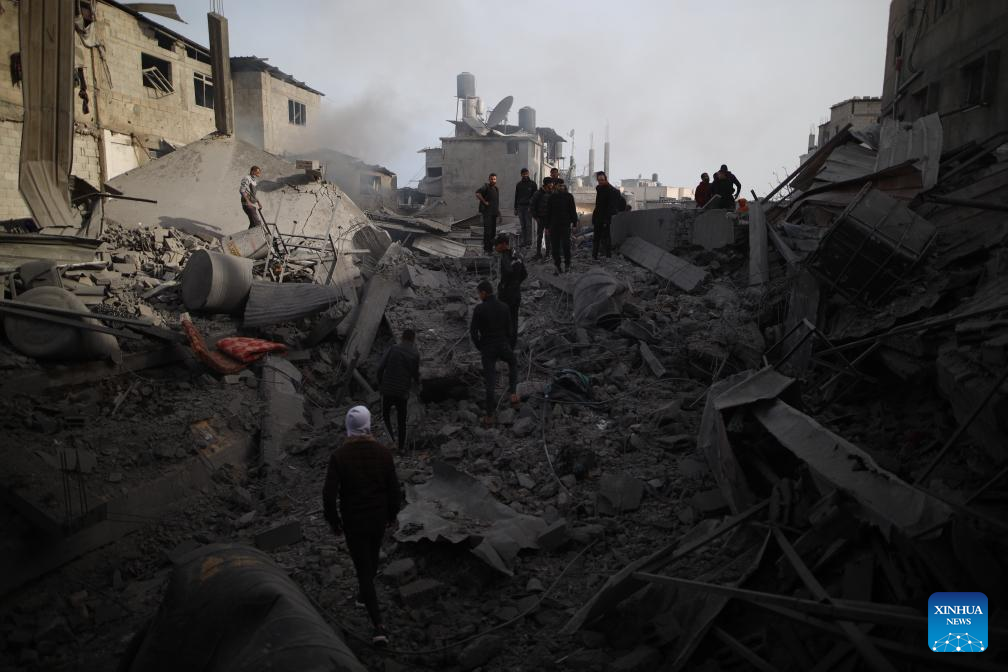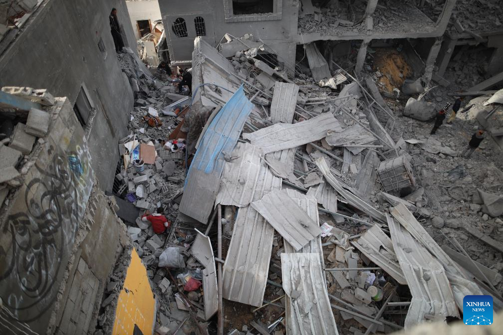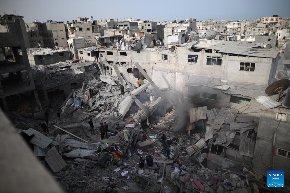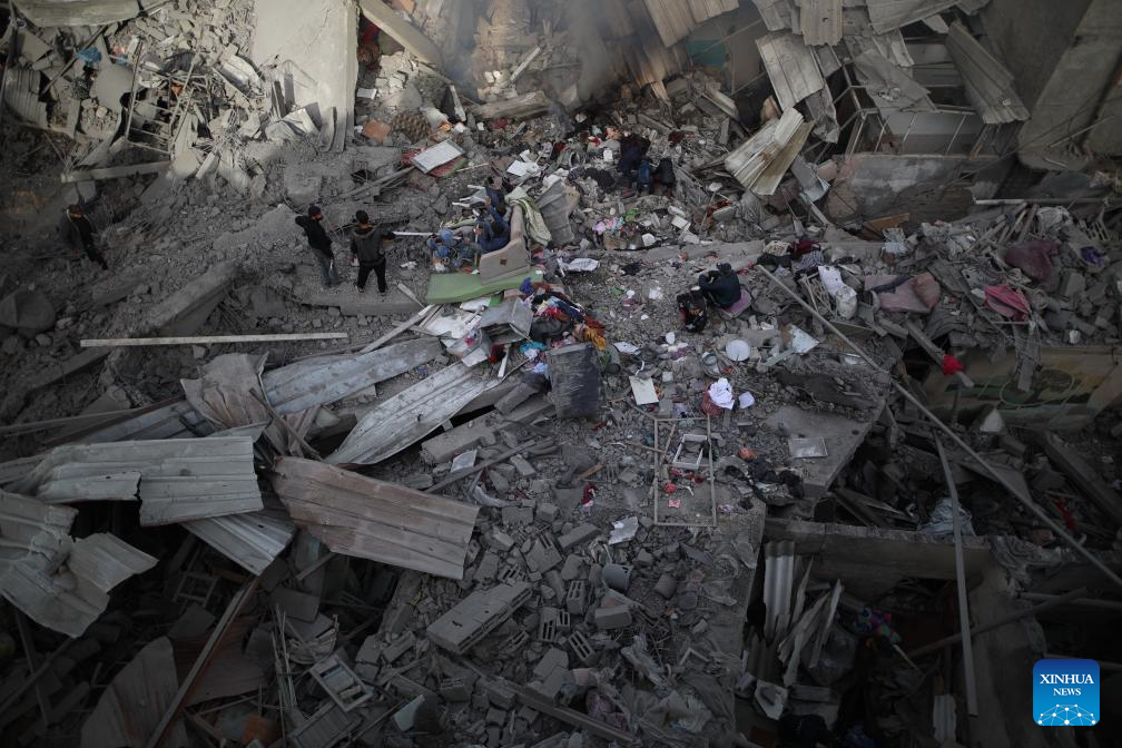 People search among the rubble after an Israeli airstrike in Maghazi refugee camp, central Gaza Strip, on March 26, 2024. The Palestinian death toll in the Gaza Strip from ongoing Israeli attacks has risen to 32,414, the Hamas-run Health Ministry said in a press statement on Tuesday. (Xinhua)