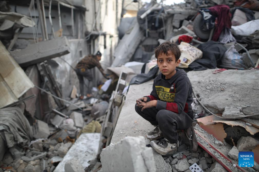 A boy sits among the rubble after an Israeli airstrike in Maghazi refugee camp, central Gaza Strip, on March 26, 2024. The Palestinian death toll in the Gaza Strip from ongoing Israeli attacks has risen to 32,414, the Hamas-run Health Ministry said in a press statement on Tuesday. (Xinhua)
