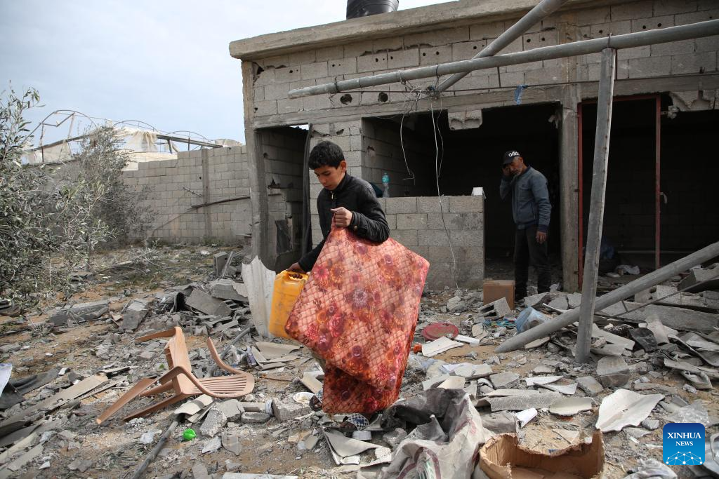 A boy collects items after an Israeli airstrike in the southern Gaza Strip city of Rafah, on March 26, 2024. The Palestinian death toll in the Gaza Strip from ongoing Israeli attacks has risen to 32,414, the Hamas-run Health Ministry said in a press statement on Tuesday. (Photo by Khaled Omar/Xinhua)