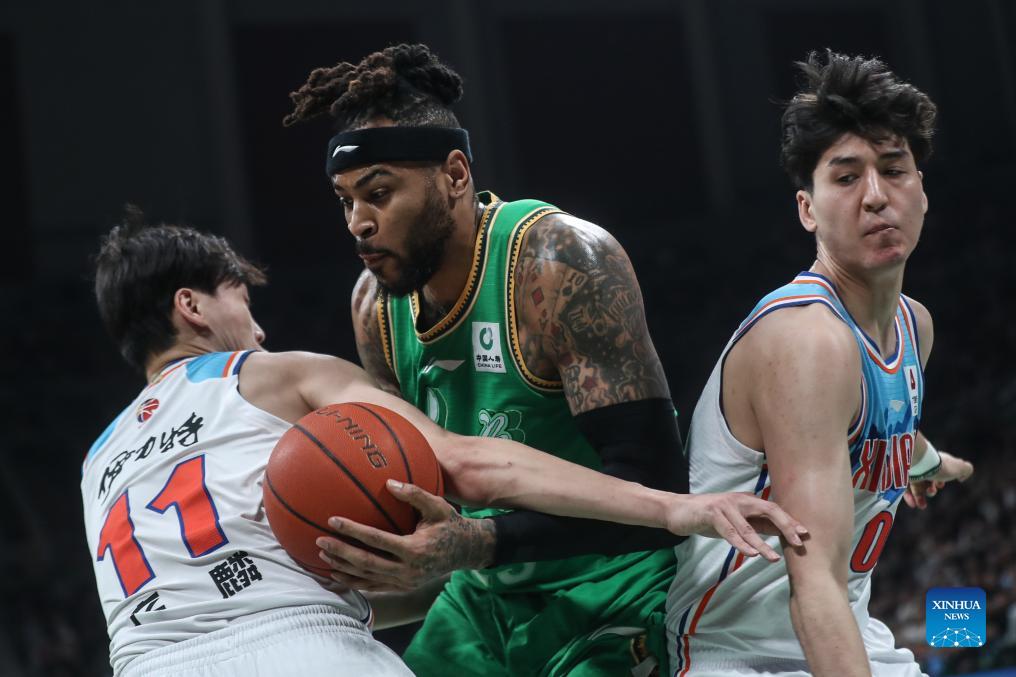 Eric Moreland (C) of Liaoning Flying Leopards breaks through during the 48th round match between Xinjiang Flying Tigers and Liaoning Flying Leopards at 2023-2024 season of the Chinese Basketball Association (CBA) league in Shenyang, northeast China's Liaoning Province, March 26, 2024. (Xinhua/Pan Yulong)