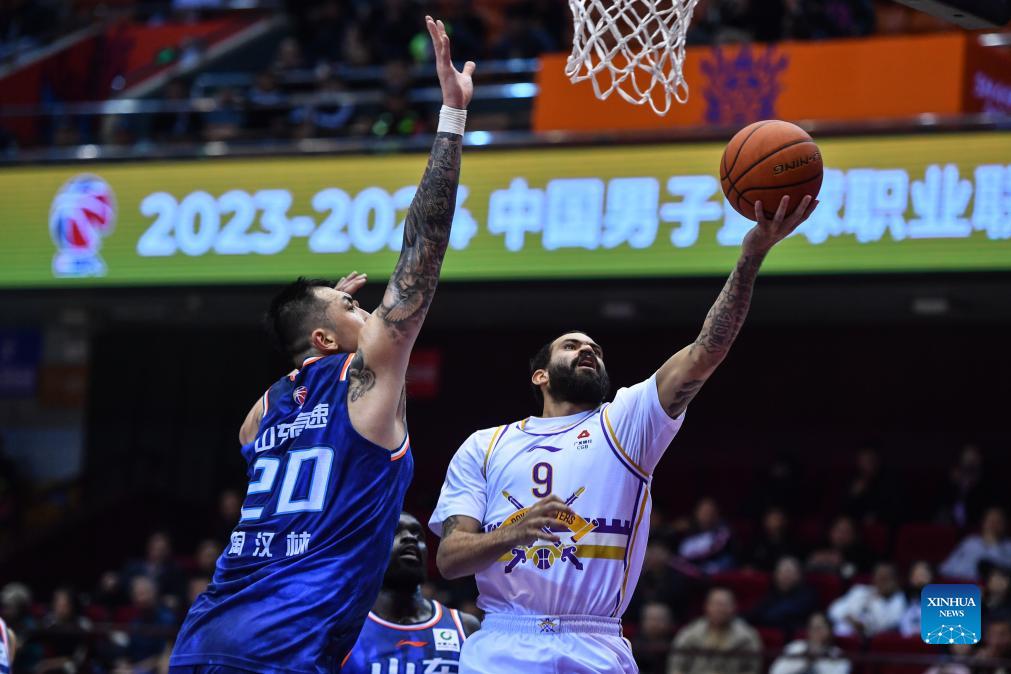Grant Riller (R) of Beijing Royal Fighters goes for a lay-up during the 48th round match between Shandong Heroes and Beijing Royal Fighters at 2023-2024 season of the Chinese Basketball Association (CBA) league in Jinan, east China's Shandong Province, March 26, 2024. (Xinhua/Zhu Zheng)