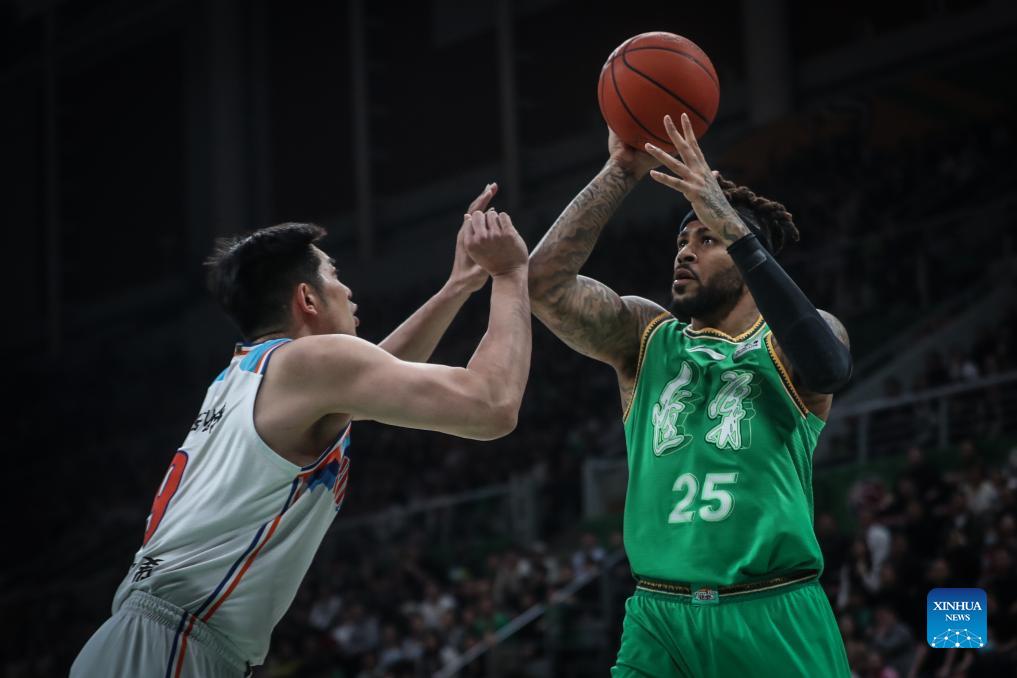 Eric Moreland (R) of Liaoning Flying Leopards shoots during the 48th round match between Xinjiang Flying Tigers and Liaoning Flying Leopards at 2023-2024 season of the Chinese Basketball Association (CBA) league in Shenyang, northeast China's Liaoning Province, March 26, 2024. (Xinhua/Pan Yulong)