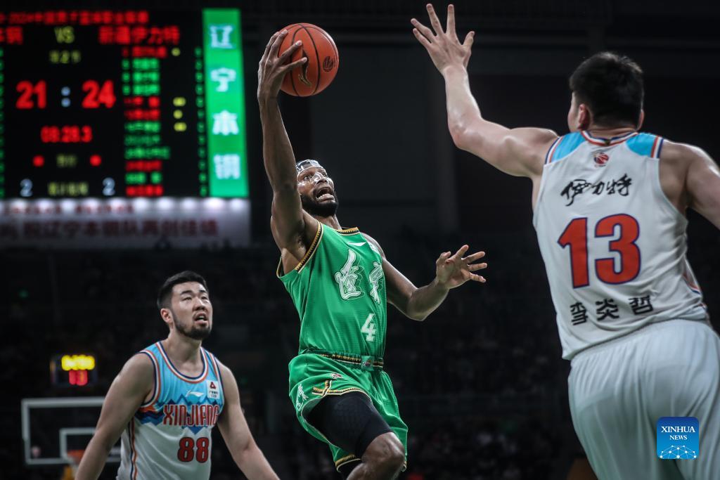 Kyle Fogg (C) of Liaoning Flying Leopards goes up for a basket during the 48th round match between Xinjiang Flying Tigers and Liaoning Flying Leopards at 2023-2024 season of the Chinese Basketball Association (CBA) league in Shenyang, northeast China's Liaoning Province, March 26, 2024. (Xinhua/Pan Yulong)